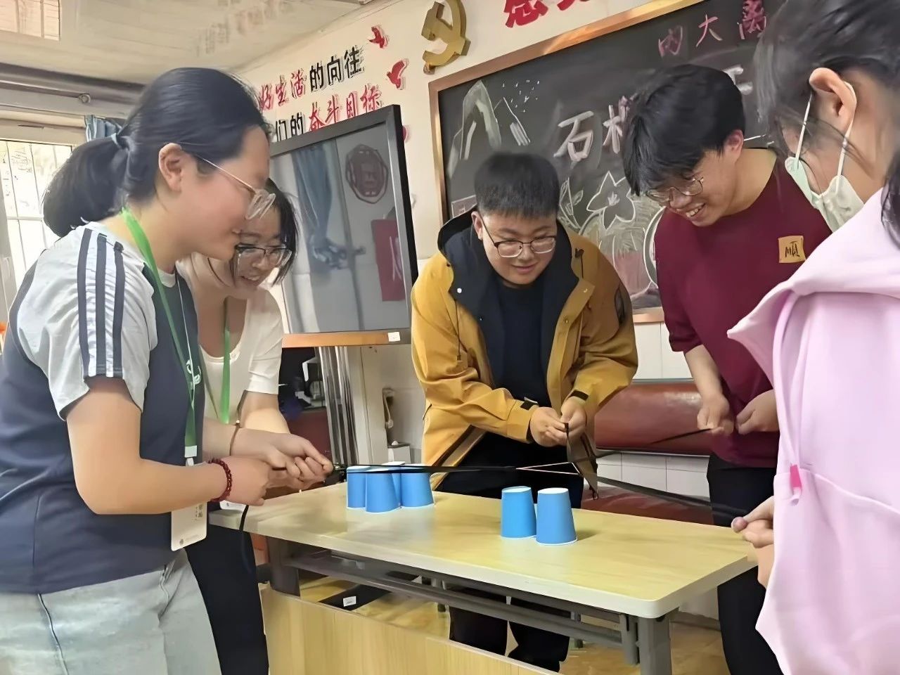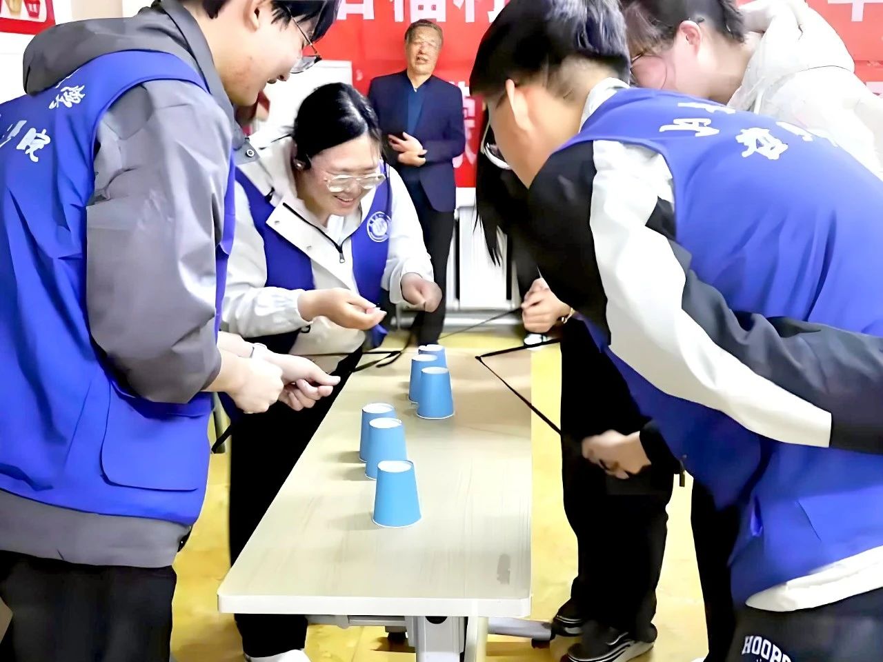 架起团结桥,共绘同心圆。团结协作游戏环节将本次活动推向高潮,志愿者们分组挑战“同心塔”搭建——通过皮筋合力操控纸杯叠塔,既考验团队默契,更在紧张有趣的互动中打破隔阂。当最后一座纸杯塔在欢呼声中稳稳立起,“团结”二字已从抽象概念化为具体感知。紧接着的油纸伞绘制环节,则以静显动诠释团结深意。各族参与者共执画笔,绘就“华夏一家亲”的生动图景。看似简单的手工创作,实则是文化共情的过程:每一笔勾勒都是对多元文化的尊重,每一抹色彩都在编织中华民族共同的精神图腾。