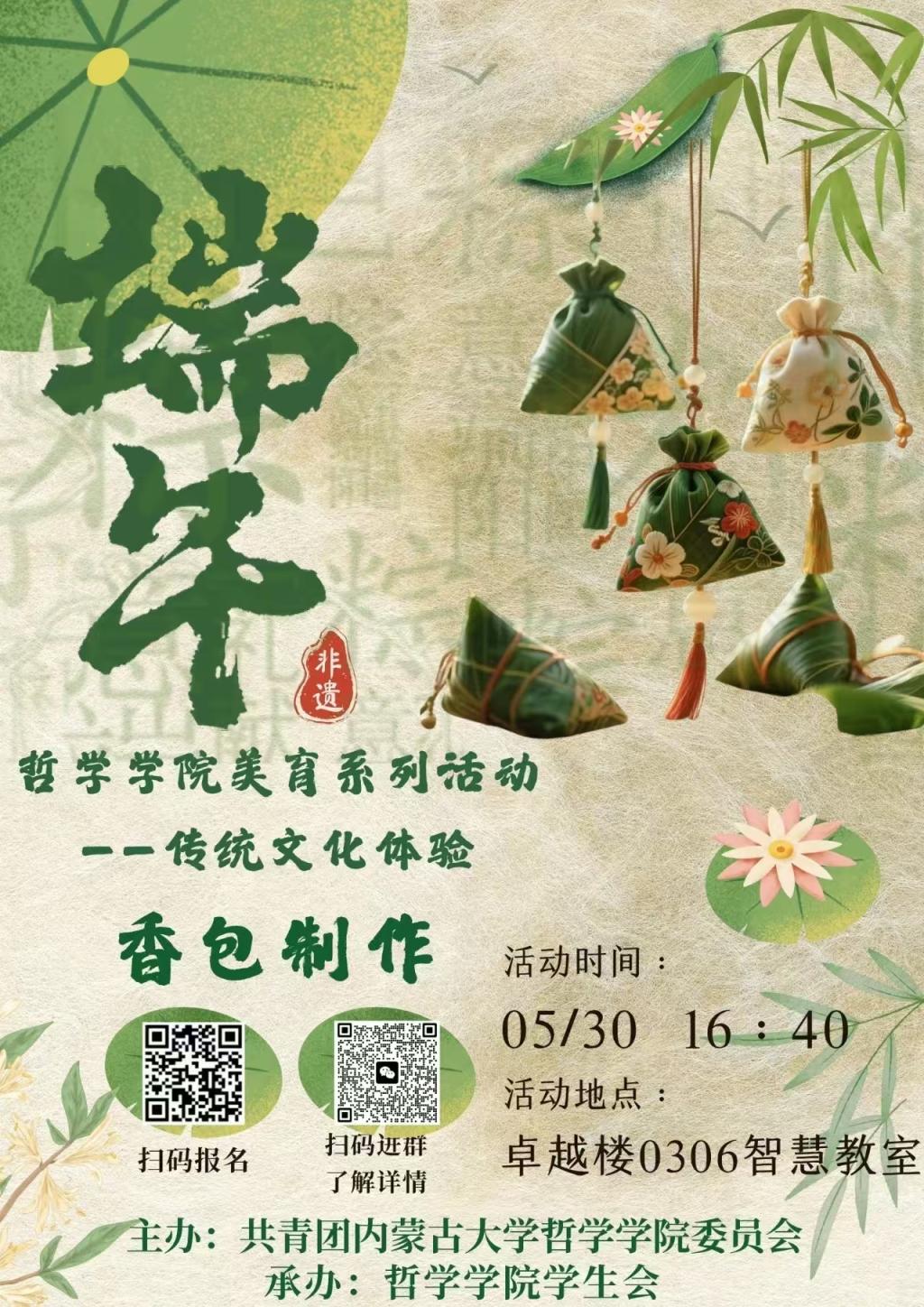 “粽叶飘香,端午情长”。365英国上市公司将于5月30日16:40举办端午节传统文化体验活动,诚邀大家相聚卓越楼0306智慧教室 ,一起动手制作香包,感受传统非遗魅力。在这个充满民俗风情的端午佳节,让我们以手作之名,传承千年文化,留住悠悠粽香,共赴这场端午之约吧~