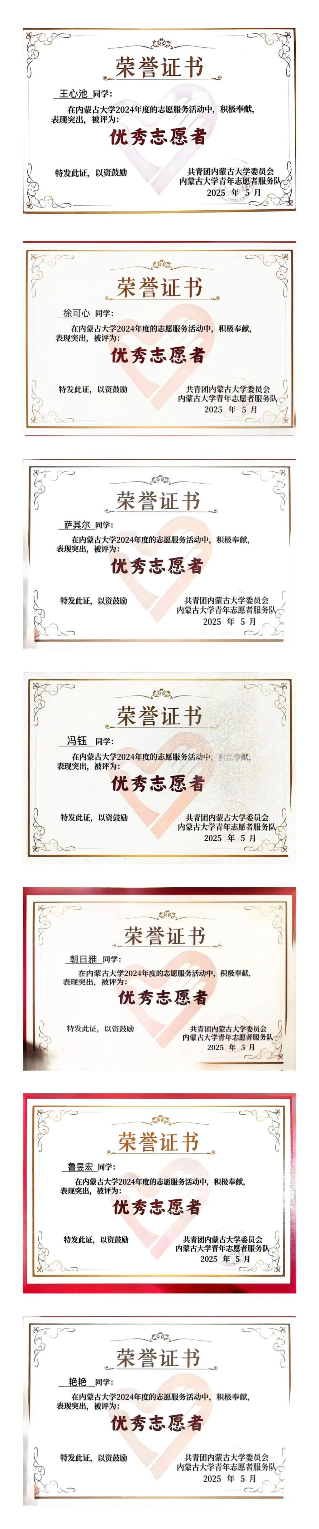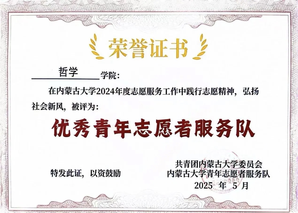 在此次评选中,王心池、徐可心、萨其尔、冯钰、朝日雅、鲁昱宏、艳艳同学因志愿服务中的卓越表现获评“优秀志愿者”称号;兰舒涵同学则以专业的礼仪服务荣获“优秀礼仪志愿者”称号。这些优秀志愿者以知行合一的服务实践,生动诠释了哲院学子“明德致知”的精神追求,展现了新时代青年“强国有我”的责任担当。