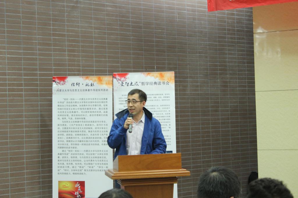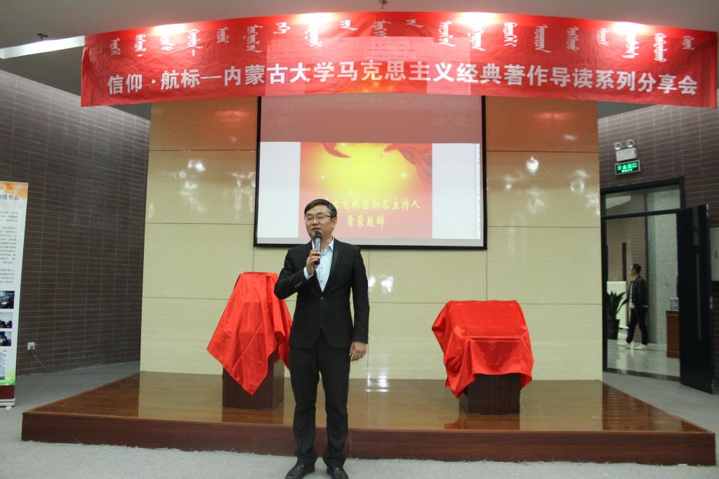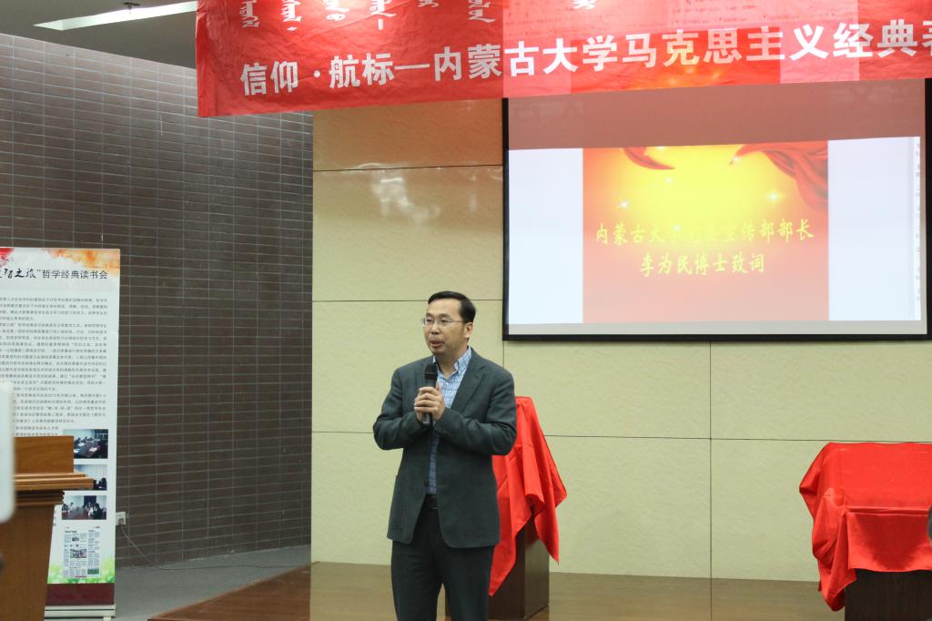 内蒙古大学党委宣传部部长李为民博士发表讲话,对雷蒙公益团队的付出表达了感谢,指出了此次活动的重要意义,鼓励同学们通过阅读马克思主义经典原著,培养自身的优秀品格。