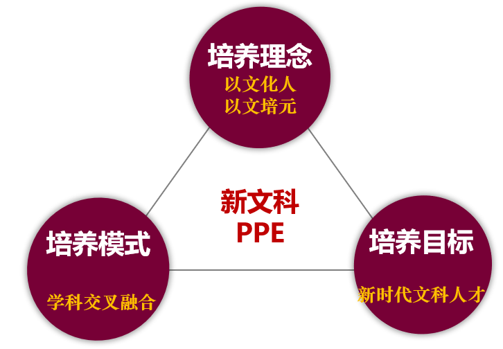 学院积累了跨学科人才培养经验,在此基础上积极推进“哲学+”为主导的新文科建设,2020年,与公共管理学院和经济管理学院合作建设PPE专业,旨在打破因学科孤立带来的理论短视与思维局限,按照宽口径、厚基础、跨学科的方向培养学生,融会贯通哲学、政治学与经济学三个专业的理论与方法,集古典与创新为一体,立志于培养具有宽广视野和学术潜力的研究型人才、具有使命感领导力和家国情怀的区域领军人才、具有创新能力和实干精神的行业精英。