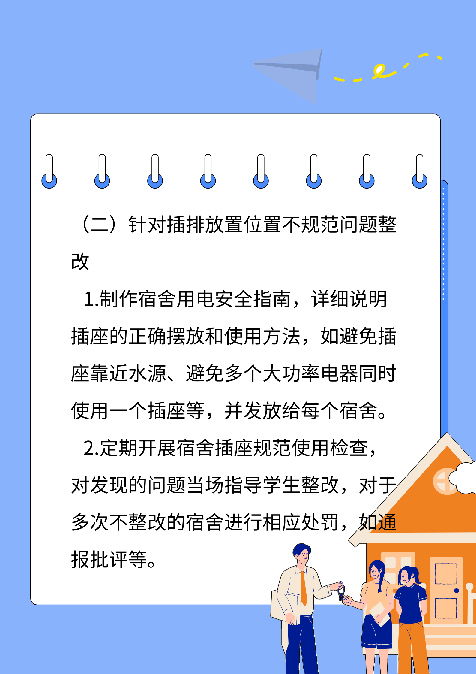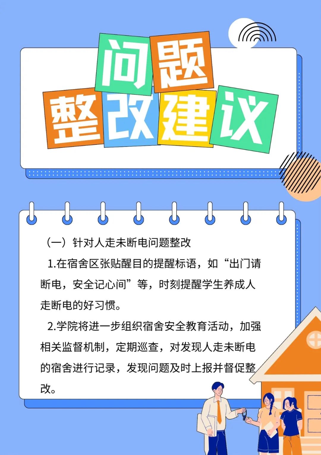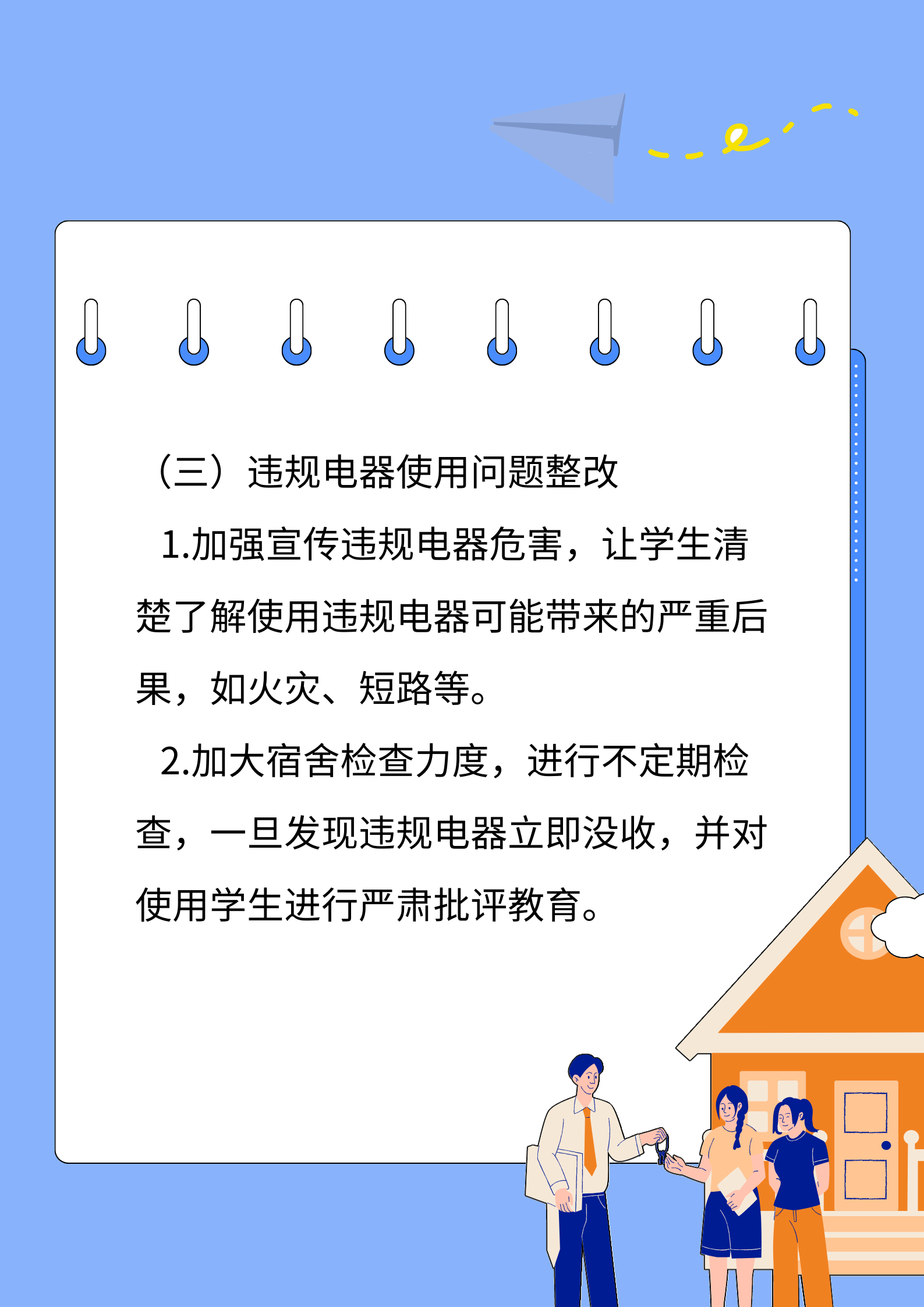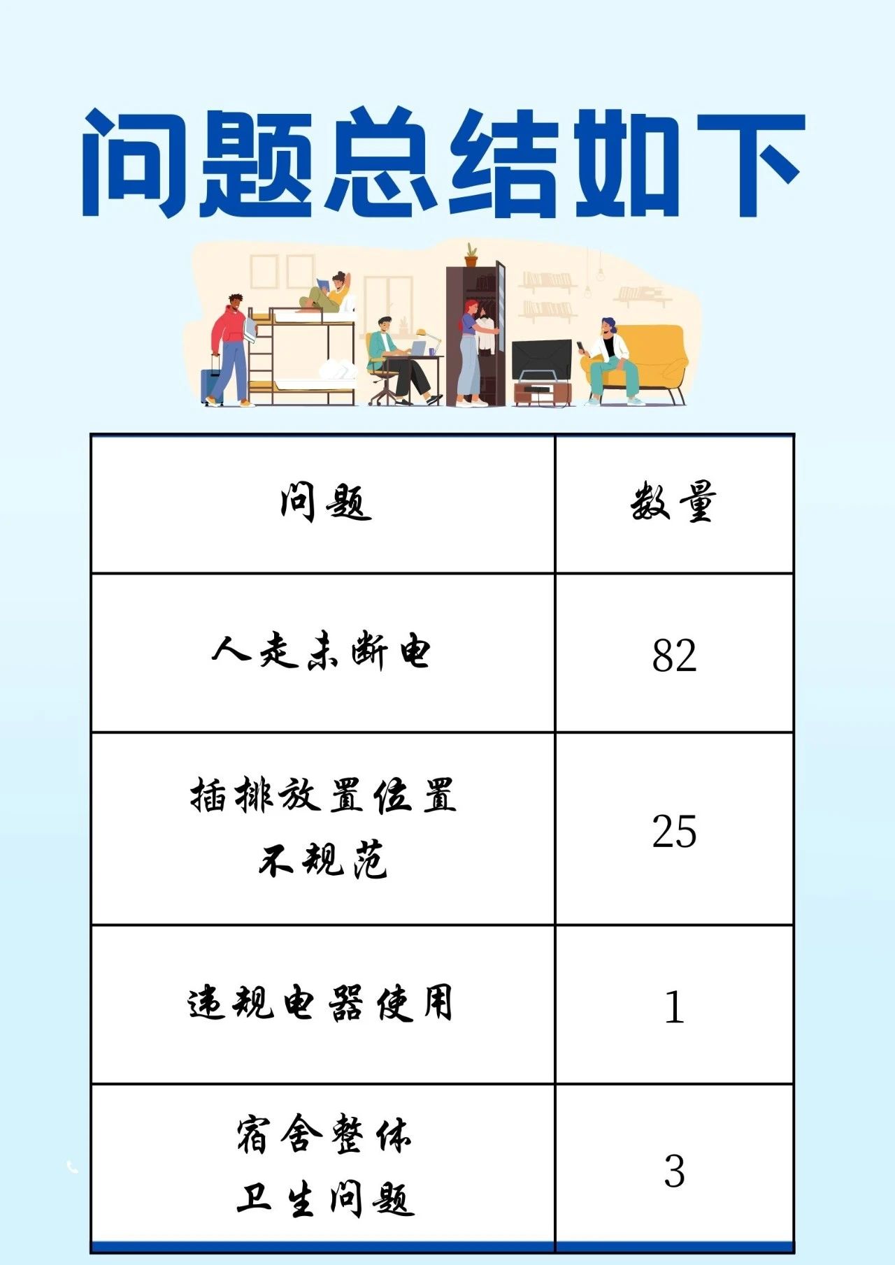 各宿舍在安全、卫生和秩序等方面整体表现良好,但仍有宿舍存在不足之处,主要在以下四方面:(一)人走未断电的情况最为突出,这一问题存在重大安全隐患,电器长时间运行可能引发火灾等危险;(二)插放放置位置不规范,不恰当的插放位置易导致触电风险或损坏电器;(三)少数违规电器使用情况,违规电器功率大,易造成电路故障,已告知同学并进行整改;(四)部分宿舍整体卫生问题,脏乱的环境不仅影响生活质量,还可能滋生细菌,危害学生健康。
