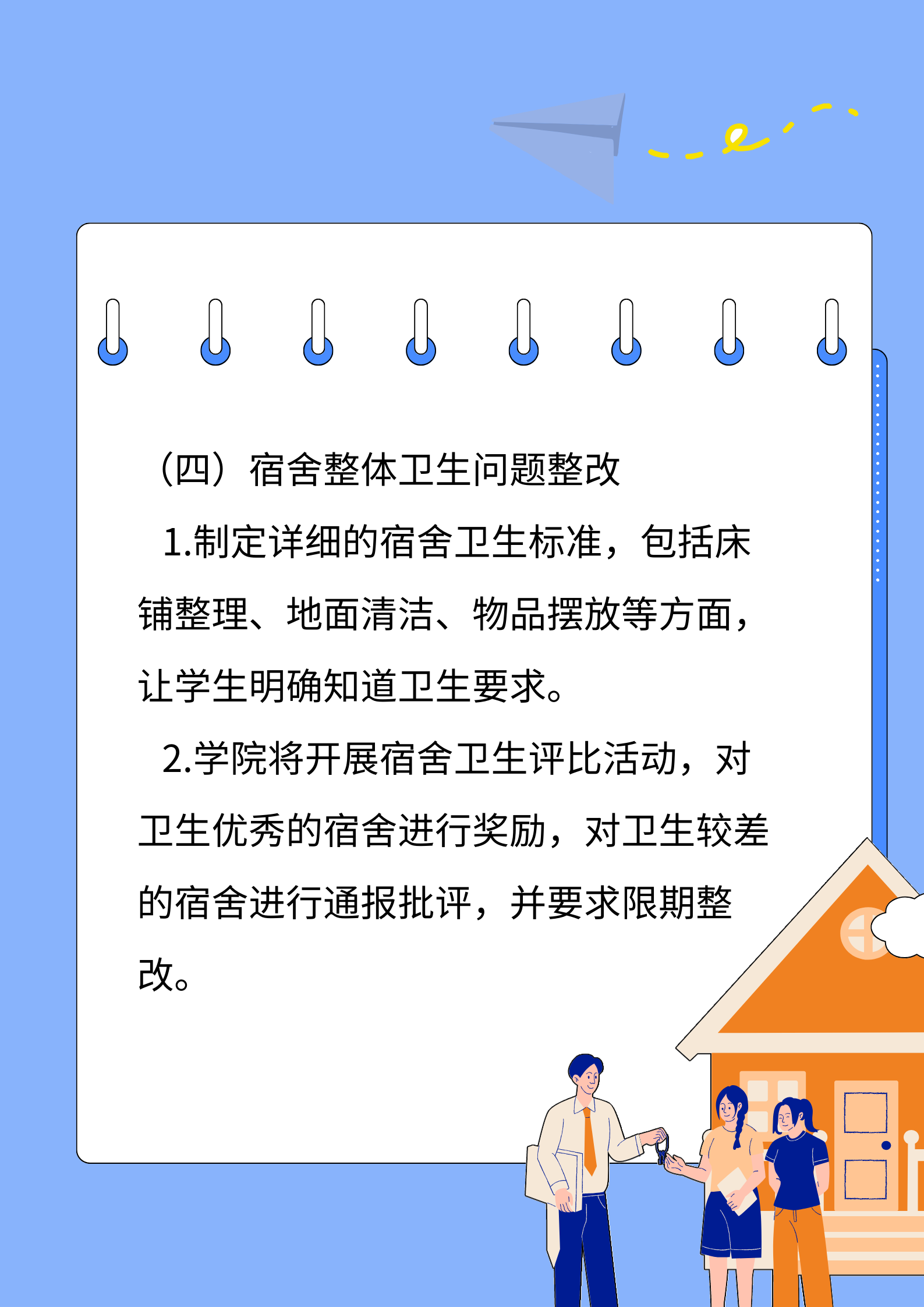 为改善宿舍状况,提出以下建议:一是加强安全教育,制作宣传资料,提高学生安全意识,二是完善宿舍管理制度,建立违规惩戒机制,设立卫生标准和评分制度,三是加强日常监督检查,发挥学生自我管理作用。