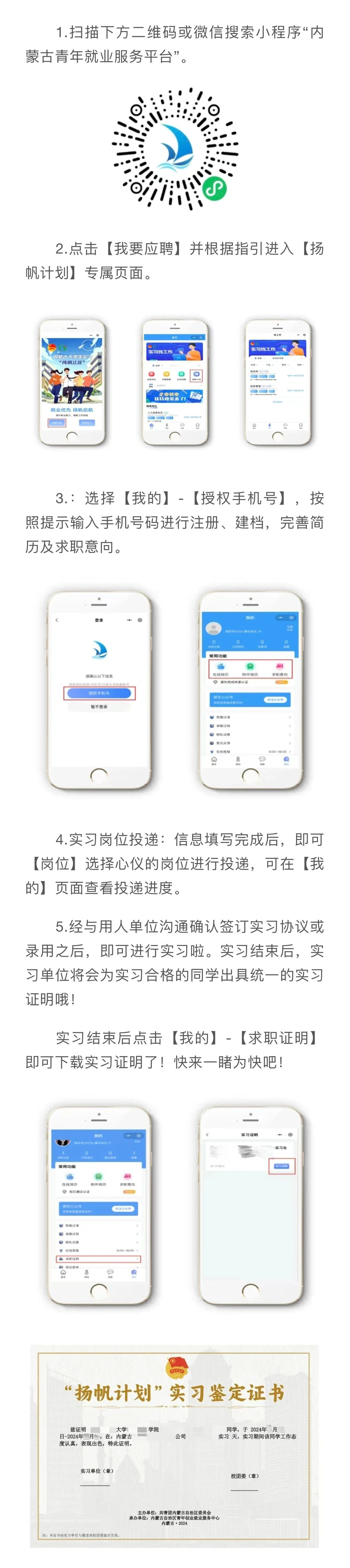 有意向的同学可搜索微信小程序“内蒙古青年就业服务平台”或关注“呼和浩特共青团”官方微信公众号,点击“扬帆计划”报名入口,按照提示输入手机号码进行注册、建档,完善简历及求职意向。信息填写完成后,即可选择心仪的岗位进行投递,可在我的页面查看投递进度。经与用人单位沟通确认签订实习协议或录用之后,即可进行实习啦。实习结束后,实习单位将会为实习合格的同学出具统一的实习证明哦!