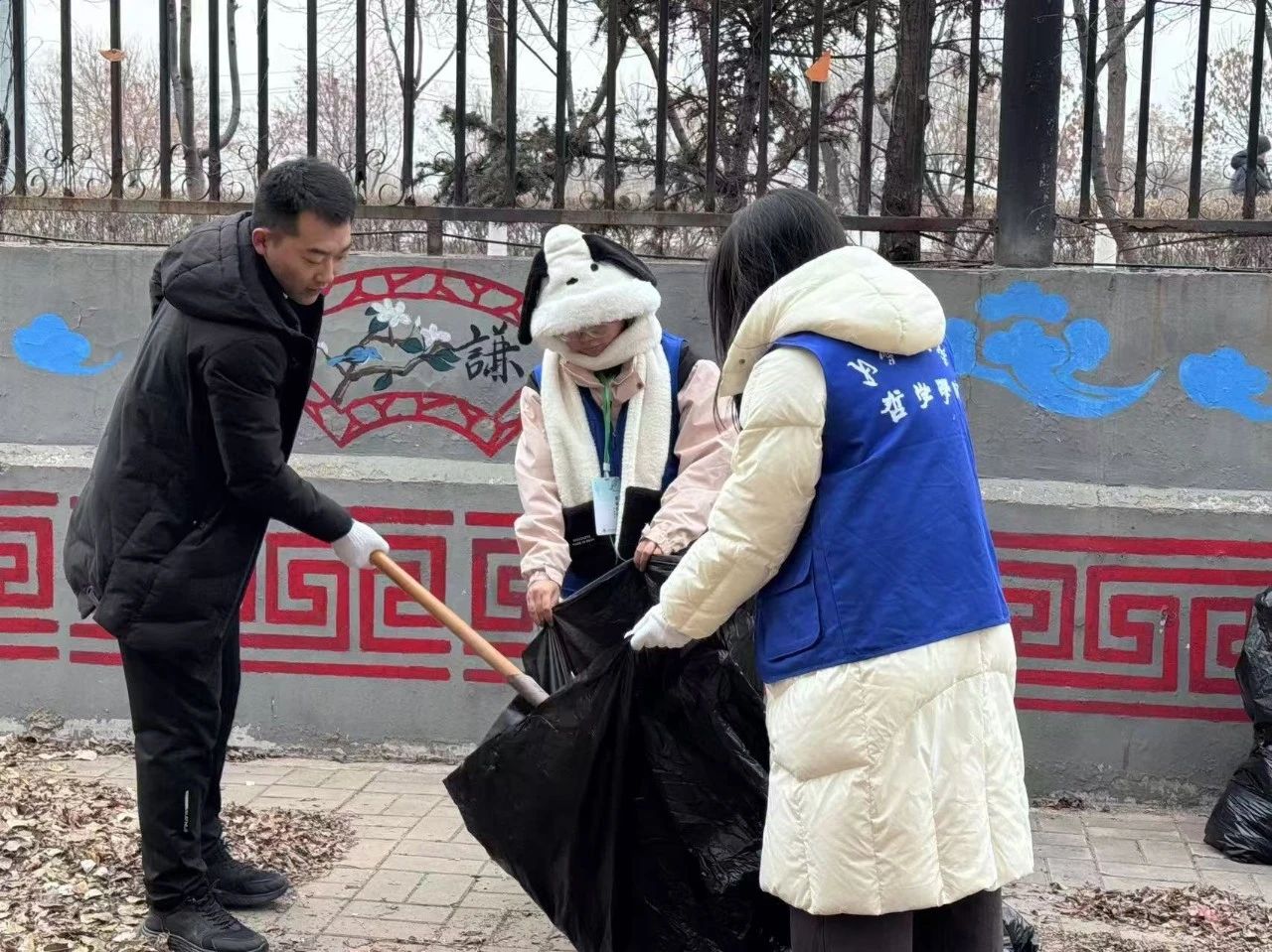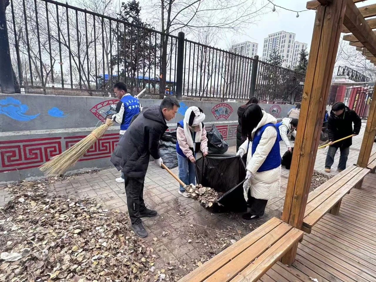 仲冬之际,清扫旧尘。“扫尘”既蕴含着驱除病疫、祈求新年安康的寓意,也包含着除“陈”(尘)布新的情感愿望。志愿者们怀着对新一年的憧憬,对过去一年的回顾,走进社区,开展此次志愿服务活动。此次活动,老师和社区工作者们也参与其中,与志愿者们并肩作战。志愿者们手持扫帚和铁锨,清理小区道路以及健身器材区域的落叶和灰尘。他们分工明确、协作高效,保证清洁工作有条不紊地开展。在社区的主干道上,堆积的落叶被铁锨铲起后装入垃圾袋,每一段路面都被清理得干干净净,社区原本整洁的原貌呈现在众人眼前;花园的步道边,志愿者们弯腰仔细清理着角落的落叶和白色垃圾。师生们齐心协力,认真清扫社区的每一处角落。他们用实际行动为居民们营造了一个舒适、干净的生活环境,在传承扫尘习俗的同时,也让助人为乐的精神在社区中生根发芽,温暖了整个社区。