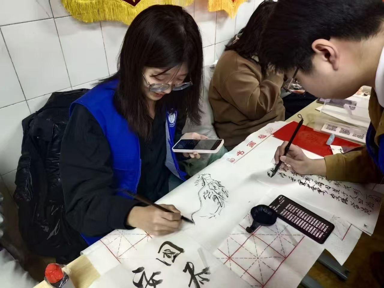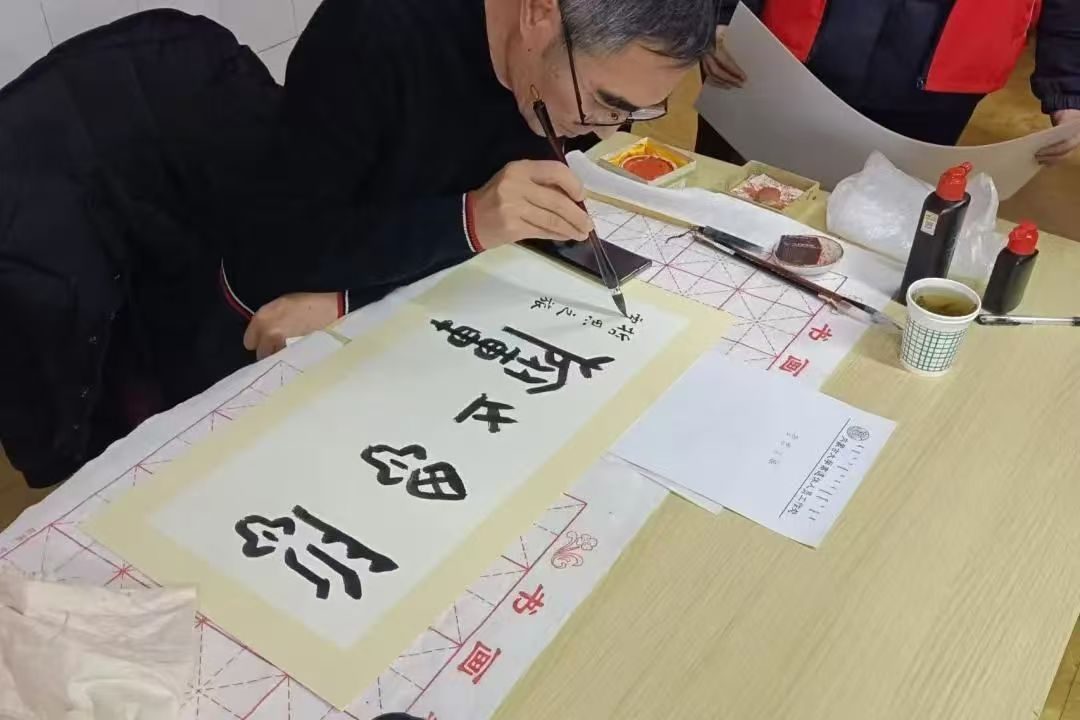 丹青留韵,翰墨流芳。贾明星老师的众多书法作品引得居民和大学生志愿者围观赞叹。他挥毫泼墨,笔走龙蛇,为居民和志愿者们送上一幅幅充满墨香与祝福的书法作品,让大家领略到书法艺术的独特魅力,也为活动增添了浓厚的文化氛围。