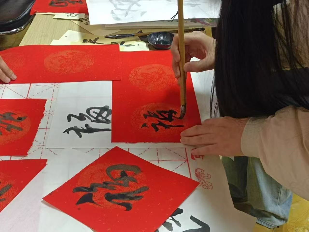 巧手匠心,创意无限。社区居民与志愿者携手合作,共同参与手工制作活动。书写福字、制作书签、缝制香囊、绘制面具,他们全神贯注于手中的材料,神情认真。在红纸上笔锋游走,书写出一个个充满墨香的福字;在布料间穿针引线,缝制出一只只满载芬芳的香包;在面具上涂涂抹抹,勾勒出一张张绚丽奇幻的面容。现场气氛温馨而祥和,大家都沉浸于传统文化的幽情雅韵之中,一笔一划、一针一线都承载着传统习俗给予的精神滋养与心灵润泽。
