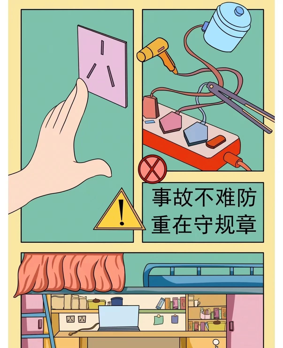 学生在宿舍中应自觉遵守宿舍管理规定,不私拉电线;不使用违规电热器具;使用电器要注意与易燃物之间保持安全防火间距;室内无人时,应拔下插头关闭电源。