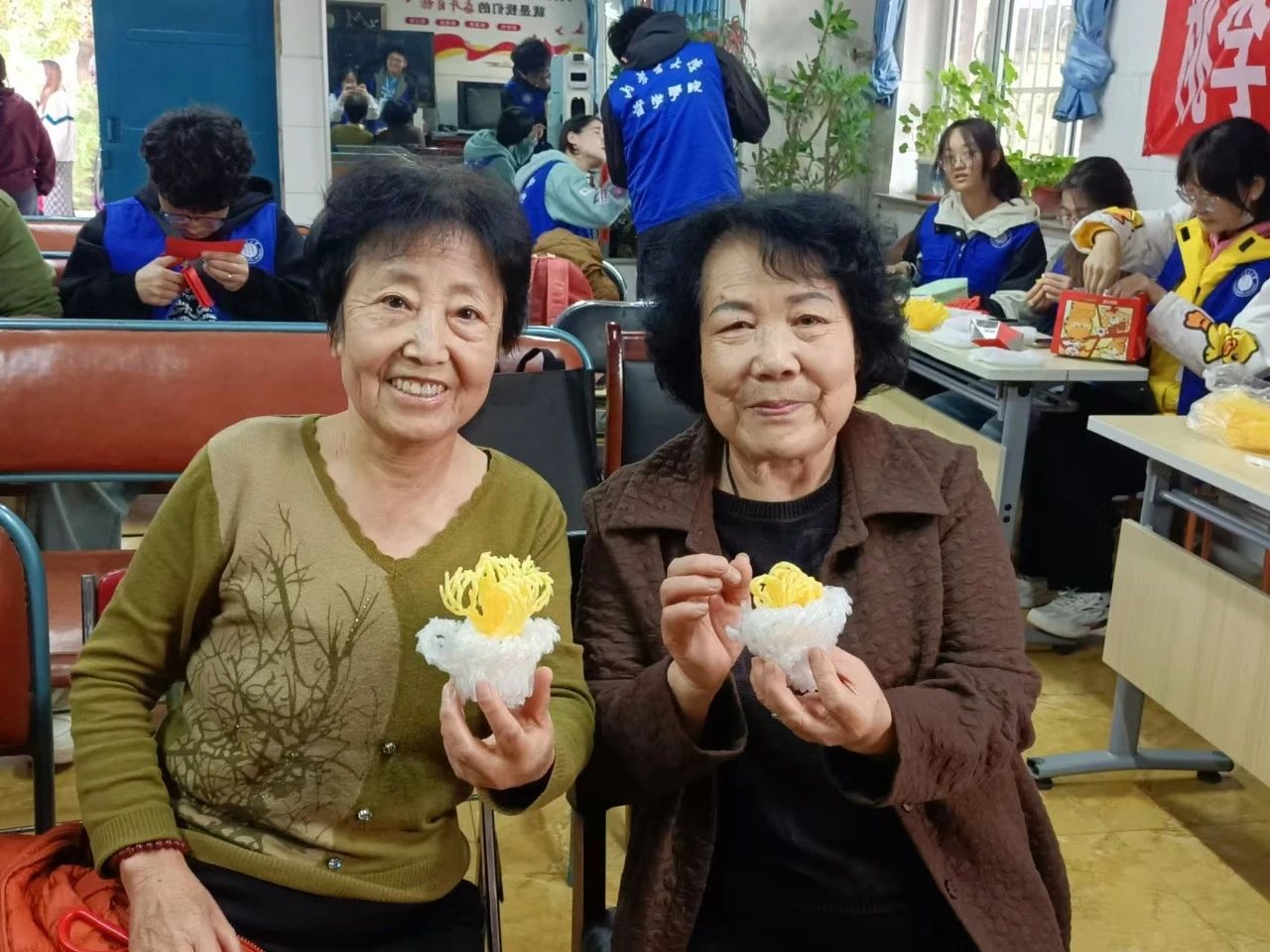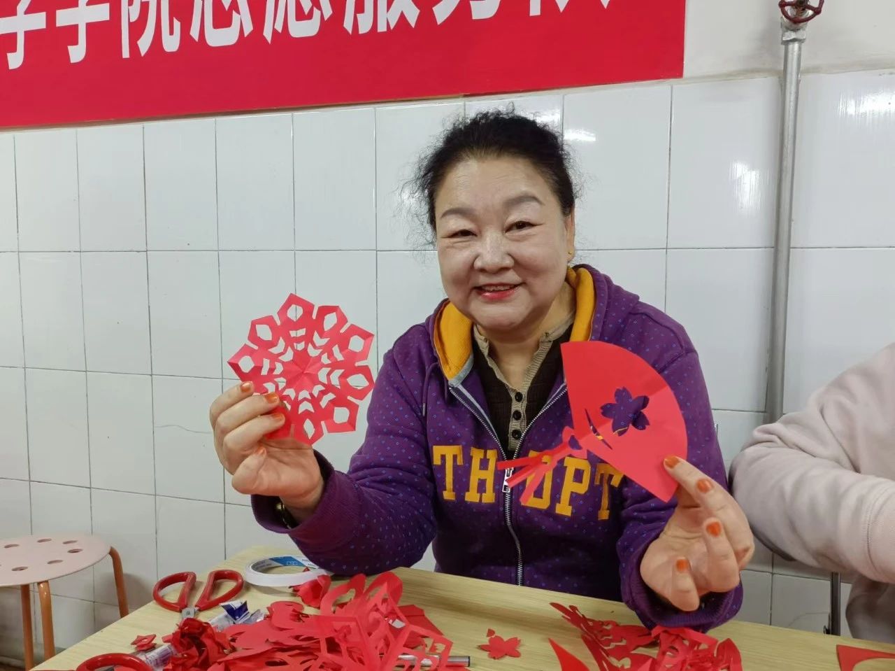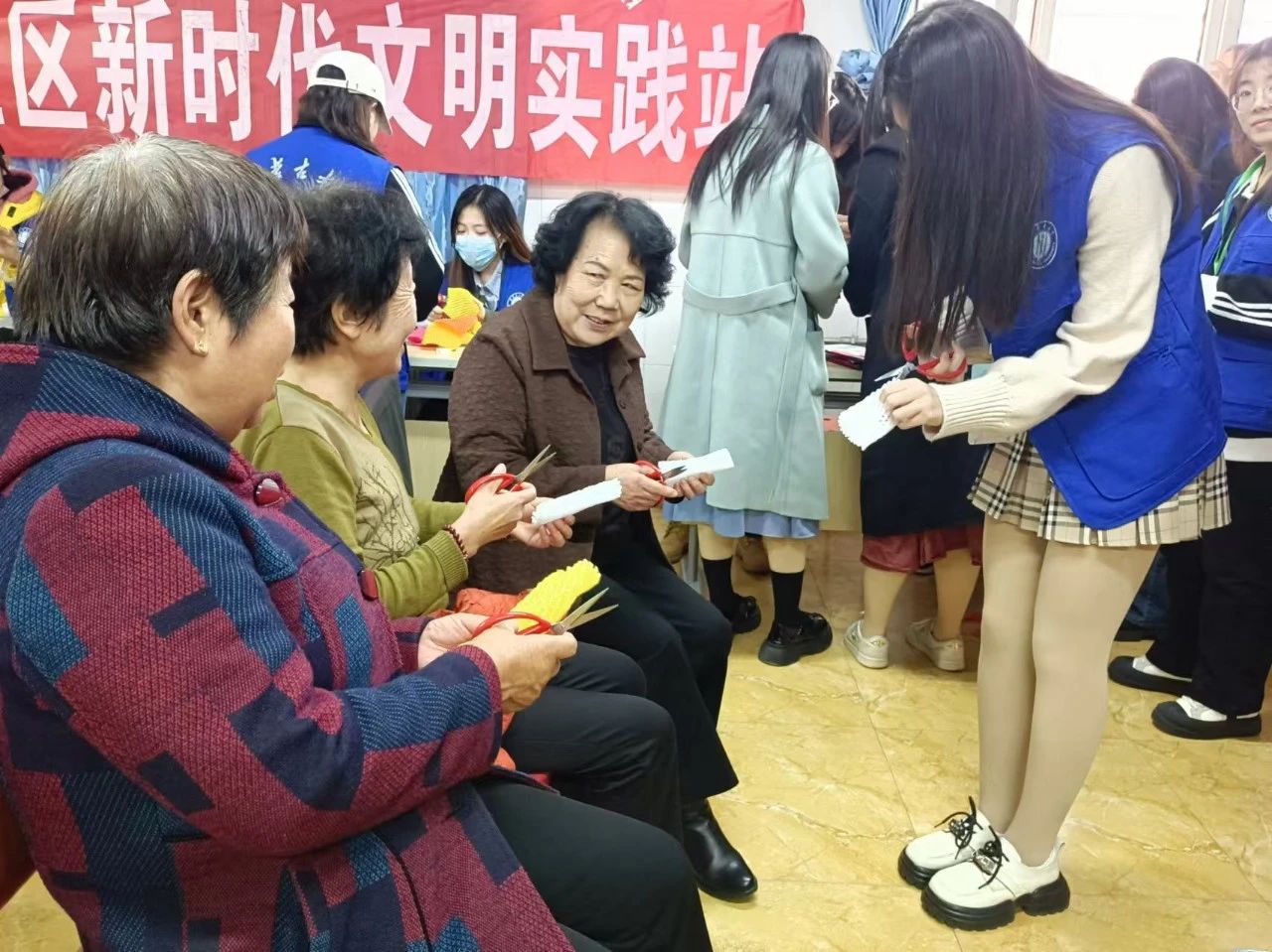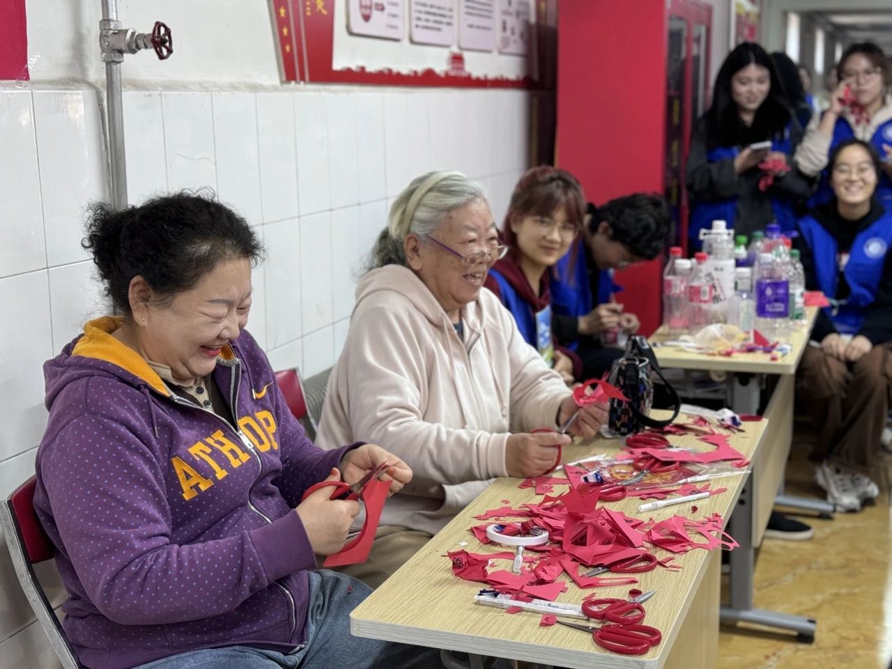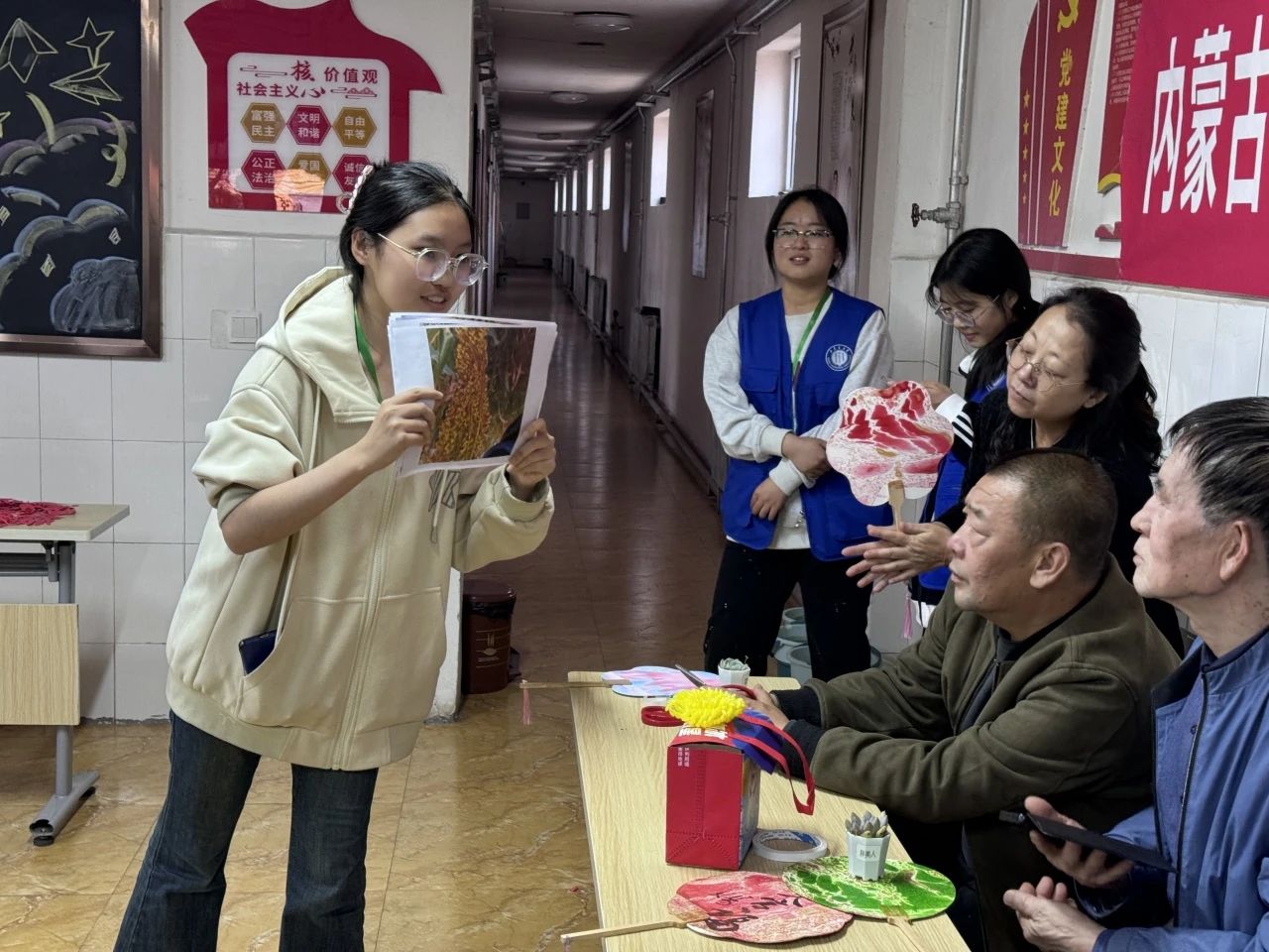 共享非遗,偕老同行。活动现场分别设置剪纸、漆扇制作的区域,为在场老人提供动手机会,亲身体验非遗制作,现场反响十分热烈,老年居民和青年志愿者们共同动手,在欢笑中体会传统文化的魅力。制作所得的作品,均用于布置老年活动中心,这不仅使活动场地更加温馨,更拉近了居民与志愿者的距离。