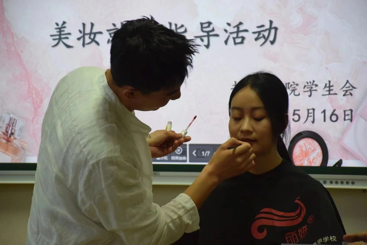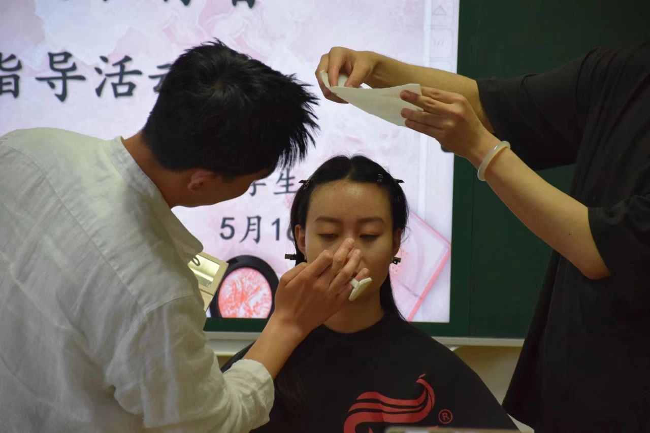 理论讲解后,老师随机选择了一名同学作为模特,从底妆、眼妆、腮红、口红等各个环节进行了实操指导,现场气氛活跃。