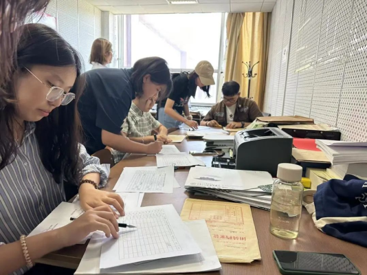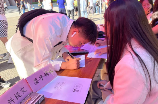在艺术楼G3018里,能看到学生干部认真拆封档案、新生确认签字、提交一系列材料的情景,学长学姐与新生们交谈融洽,两位新生班主任同时核查档案。