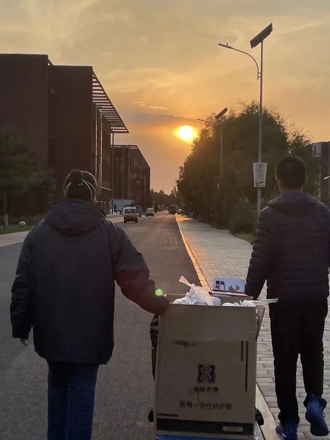 随着工作任务增多,应学校要求,学院第二批、第三批驻校老师陆续进校。2021级哲本班班主任的徐旭老师,第二批进校,承担起了学院物资配送、食堂送餐、后勤卸货的工作,并临危受命作为学生转运带队老师,于10月28日陪伴学生抵达巴彦淖尔市磴口县。第三批驻校的副院长杨泽老师、2022级哲本班班主任张楠老师、王运豪老师承担起学生返乡的工作。副院长杨泽老师护送解除隔离的学生,并配送生活用品、药品,搬运防疫物资。张楠老师、王运豪老师作为返乡跟车带队老师多次往返各地,为学生保驾护航。还有张宇心老师担任核酸采样志愿者,连续工作多日。