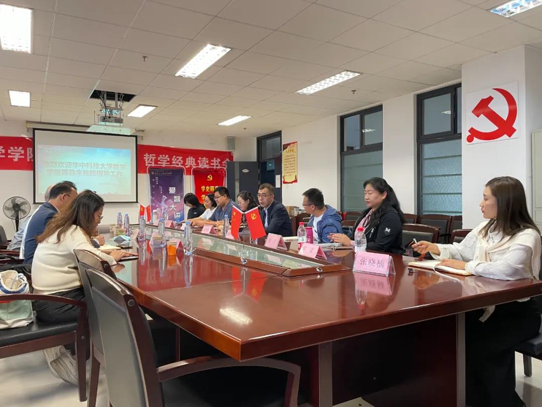 9月26日下午,华中科技大学党委书记杨海斌、院长董尚文、党委副书记闫俊懂、办公室主任邹维瑁、教务办赵璐老师一行5人,就推进学科建设、人才培养、党建工作等事宜莅临我院调研交流,我院党总支书记、院长景剑峰、党总支副书记王丽、哲学系系主任曹叶军、PPE系主任潘兆云、中哲教研室主任杨泽、马哲教研室主任邹海燕、教务办主任刘颖、团总支负责人张晓楠参加了交流座谈。