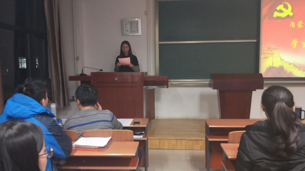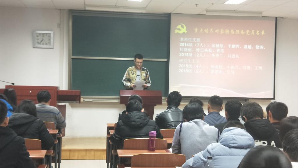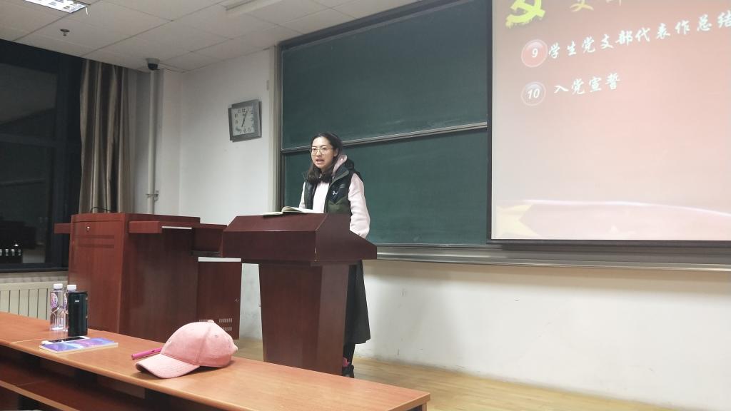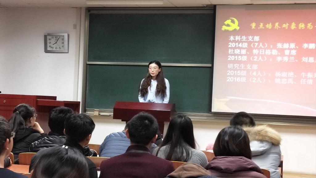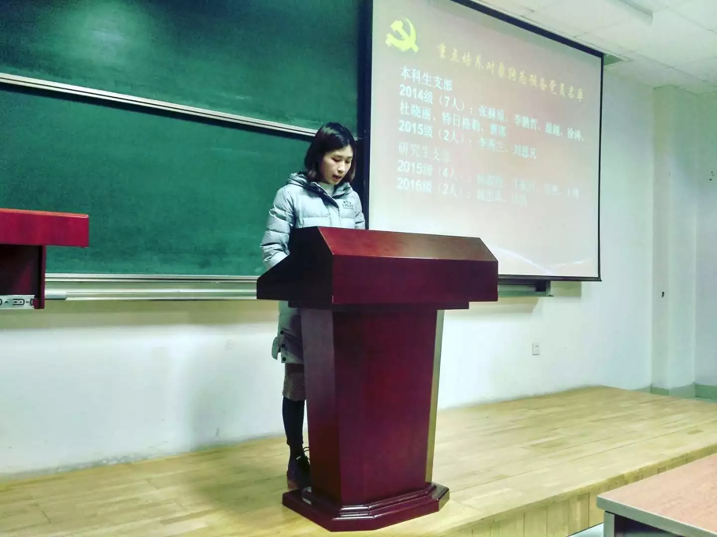 接着,主持人郭芳分别宣读了本批积极分子转重点培养对象名单,本次发展预备党员名单,本次预备党员转正名单。新党员发展对象和转正预备党员依次做了思想汇报,同学们对自己从各个方面做了深入剖析,结合个人经历,谈了什么是党员、为什么入党、怎样成为合格党员等重要问题,向党组织坦露了自己的真实想法和青年心声。入党介绍人研究生党支部陈菲同志针对入党同志的现实表现和培养考察情况表明了意见和态度。本科生党支部高慧同志作为党员代表发表意见,表达了各位老党员对新发展党员的热烈欢迎和热切期盼。