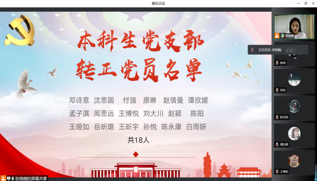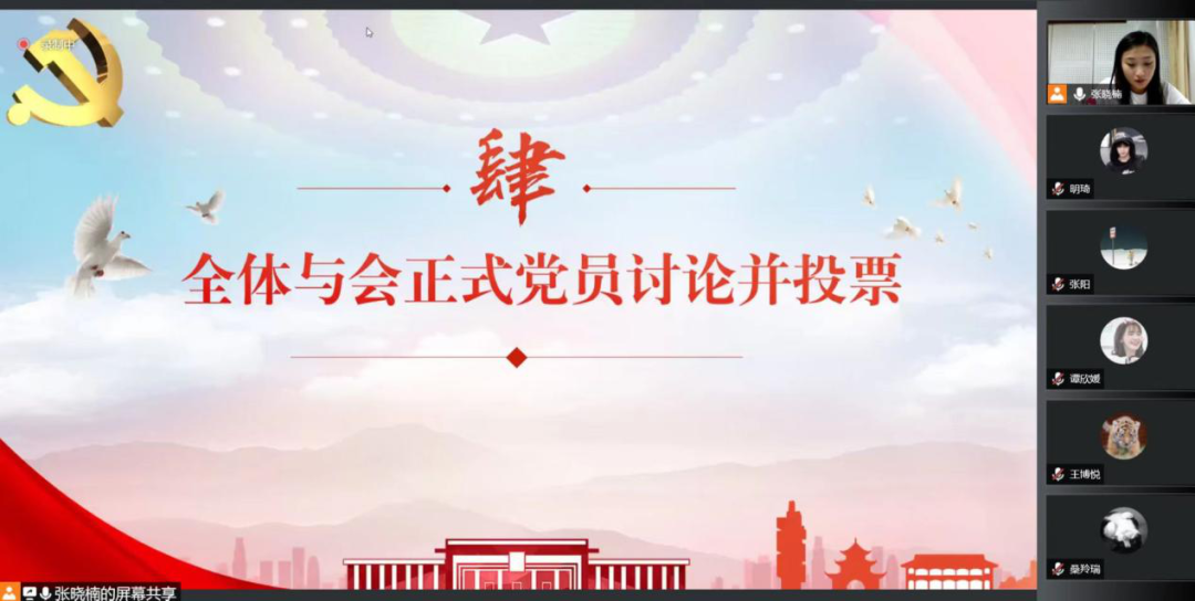 具有表决权的与会党员在听取入党介绍人转正意见的基础上,对预备党员的主要情况以及能否按期转正进行了充分讨论并线上进行无记名投票表决。党支部书记张晓楠宣布票决情况及支部大会决议。
