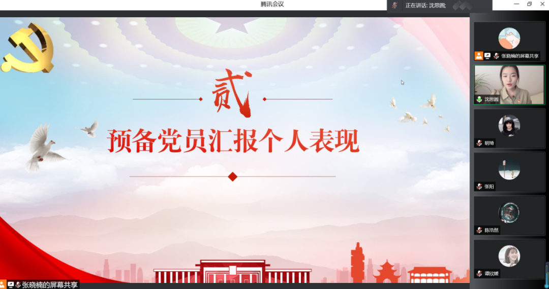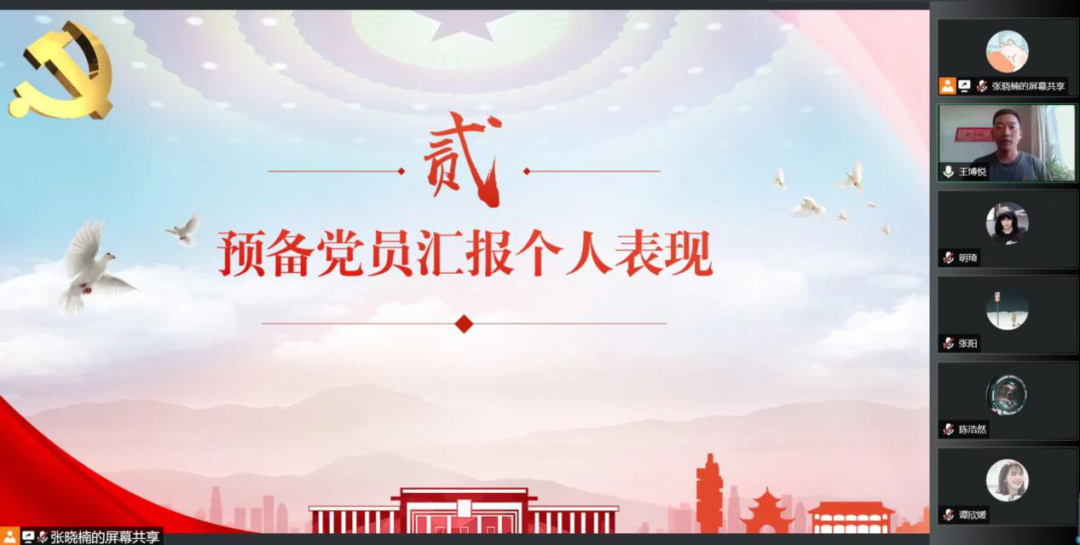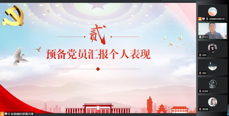 预备党员依次在线上汇报了自己在预备期间的个人表现,总结了在思想、生活、学习等方面的进步和不足,表达了渴望按期转正的意愿。