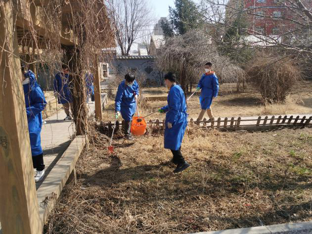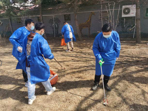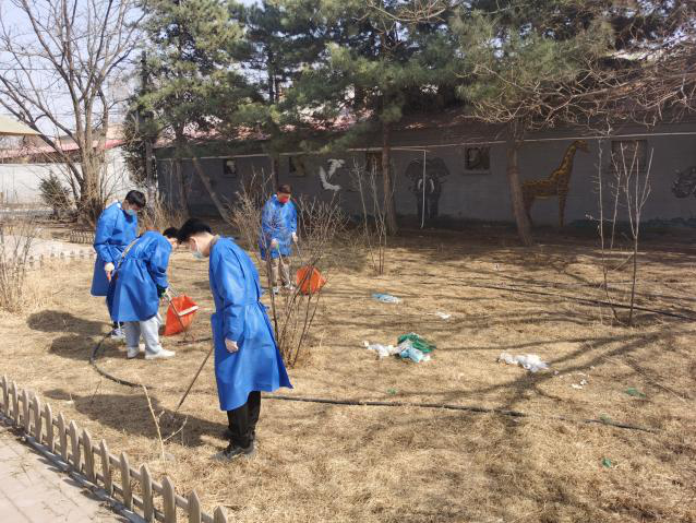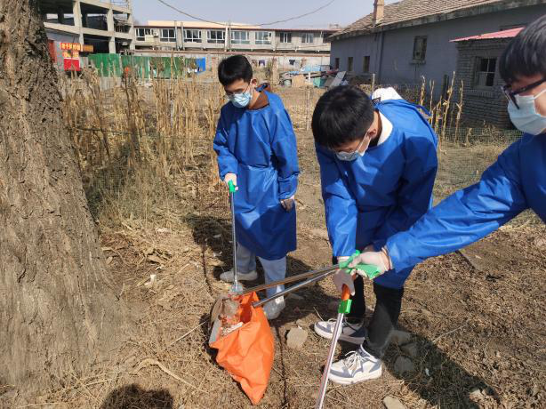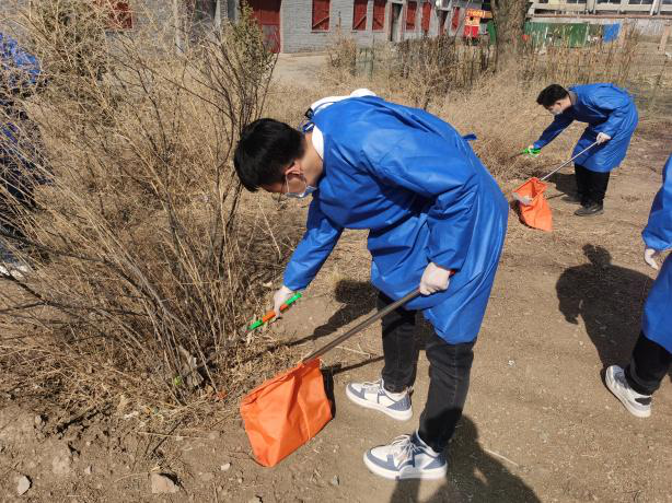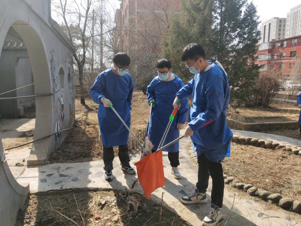 男生志愿者们利用夹子,编织袋等工具对小区内的落叶杂草进行清理,以实际行动为美化环境贡献力量。