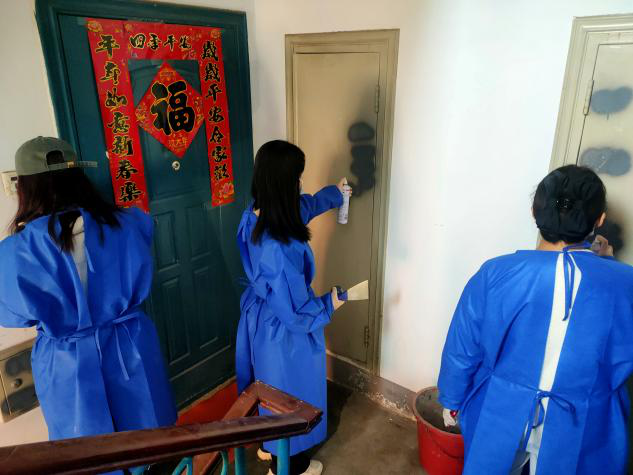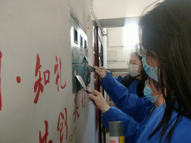 在志愿服务活动中,女生志愿者们进入小区的各个单元,利用配发的喷漆,刮刀等工具清理楼道内的杂乱广告,使墙体干净整洁,焕然一新。