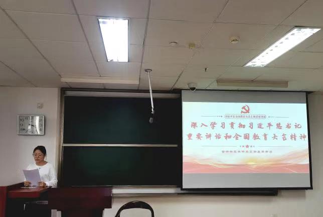 本次学习第二部分,研究生党支部书记穆明慧领学“深入学习贯彻习近平总书记重要讲话和全国教育大会精神”。习近平总书记的重要讲话高屋建瓴、思想深邃、内涵丰富,是指导新时代新征程教育工作的纲领性文献,为建设教育强国指明了前进方向、提供了根本遵循。