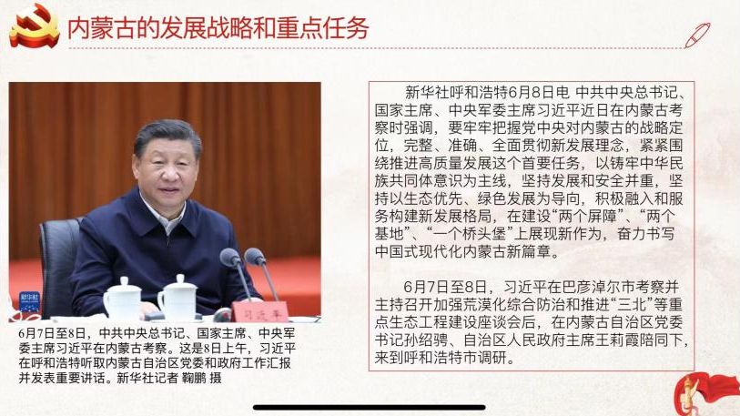 本次会议主要围绕中共中央总书记、国家主席、中央军委主席习近平于6月7日至8日在内蒙古自治区呼和浩特市考察时的重要讲话精神进行学习,会议主要通过视频学习和文本阅读两种学习方式来进行。
