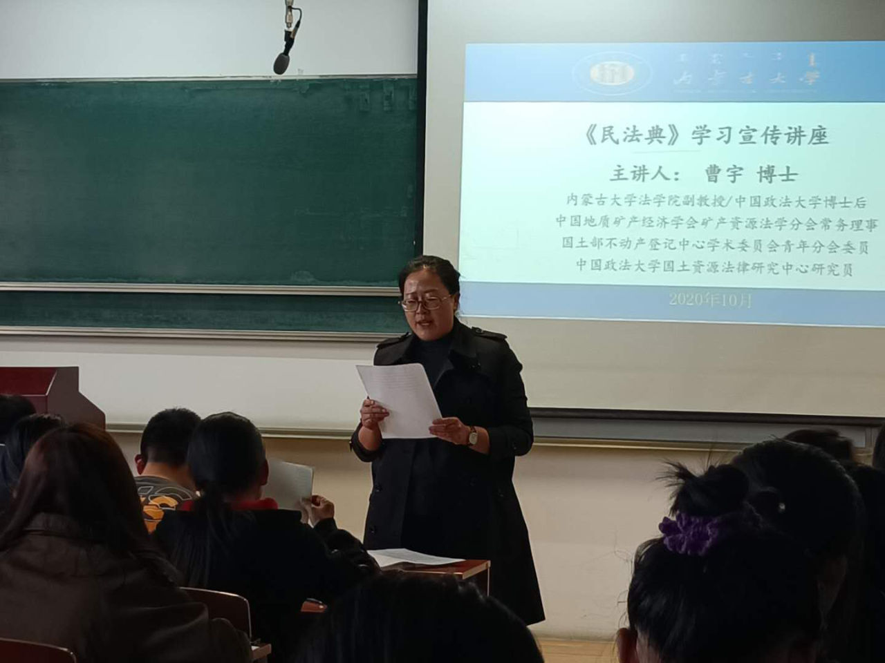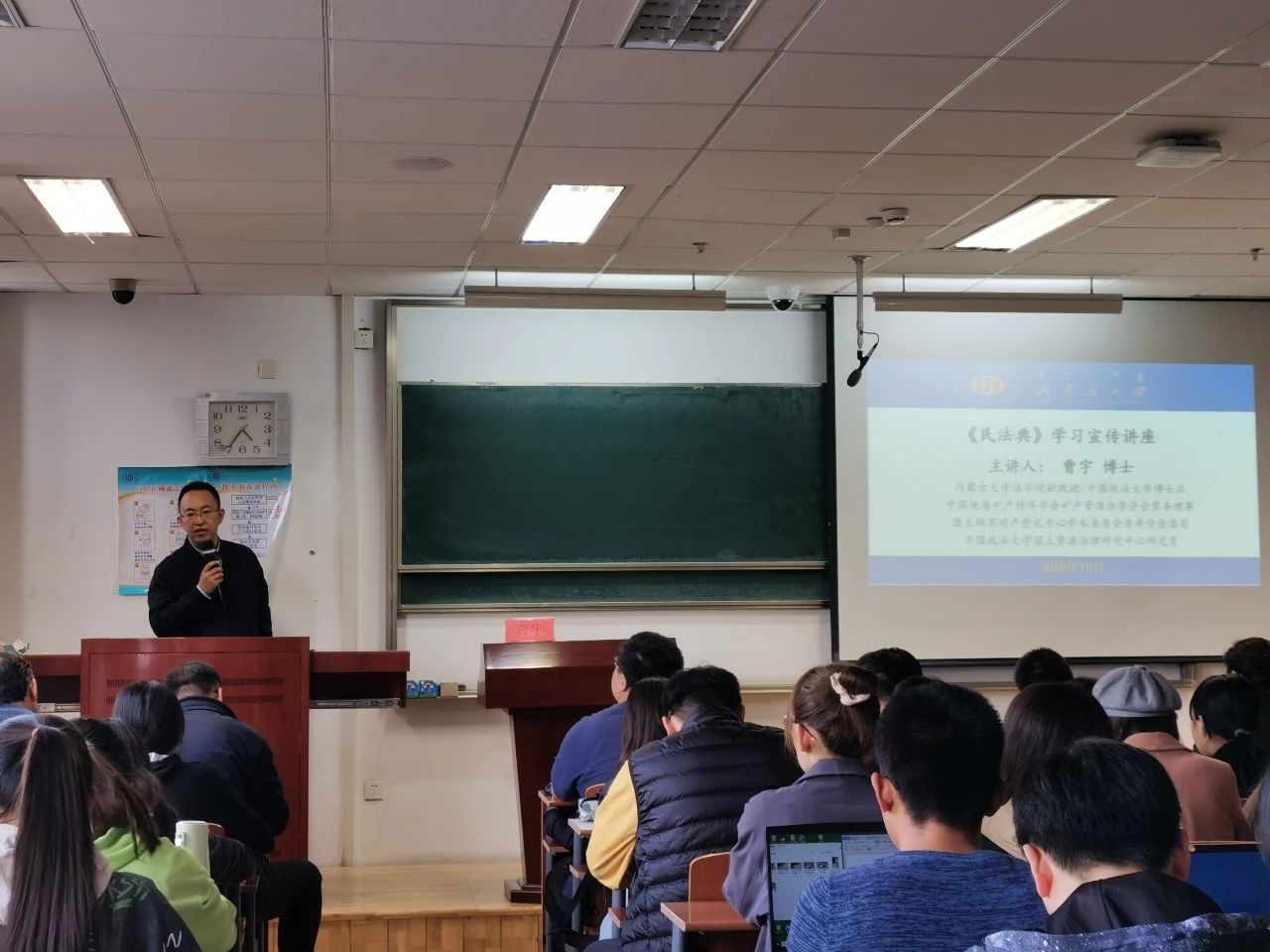 2020年10月13日16:30,365英国上市公司党总支在南校区卓越楼0509开展《民法典》学习宣传讲座。内蒙古大学法学院副教授曹宇为全体师生、党员及入党积极分子深刻解读了《民法典》,使广大师生充分认识到颁布实施《民法典》的重大意义,更好地推动《民法典》实施。本次学习宣传讲座由365英国上市公司党总支副书记王丽主持,365英国上市公司全体师生党员、积极分子参加了本次党课。