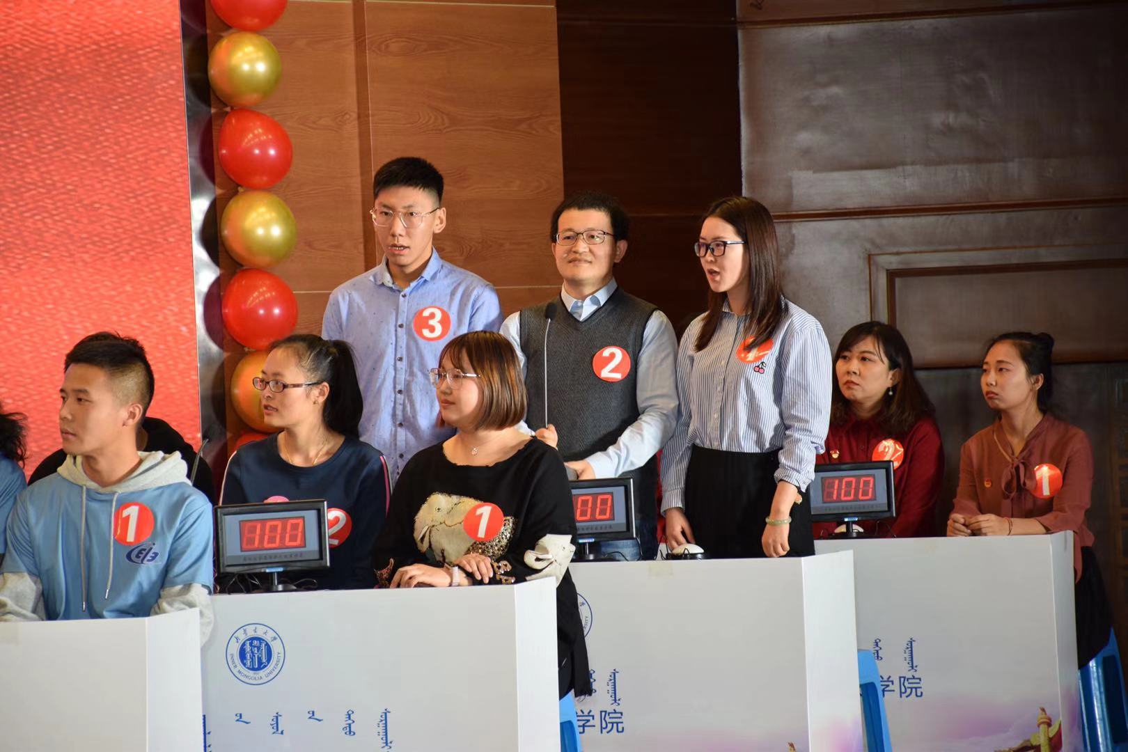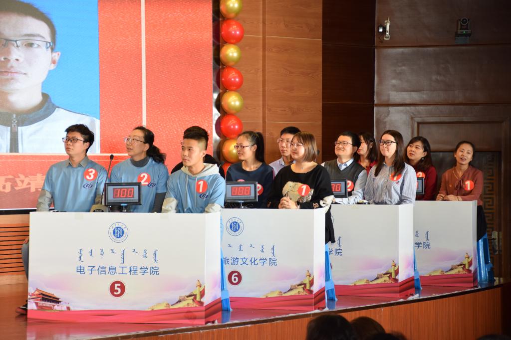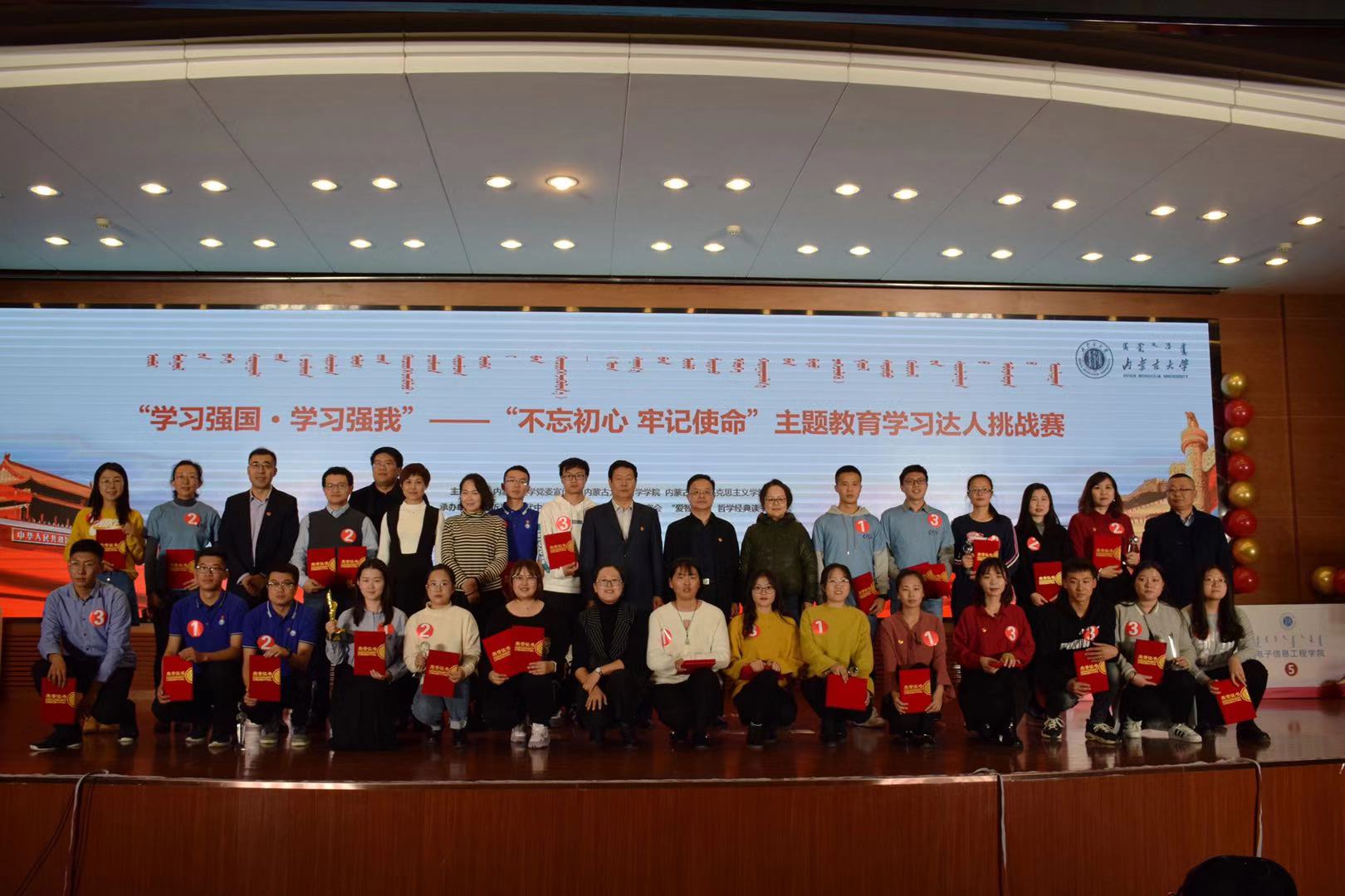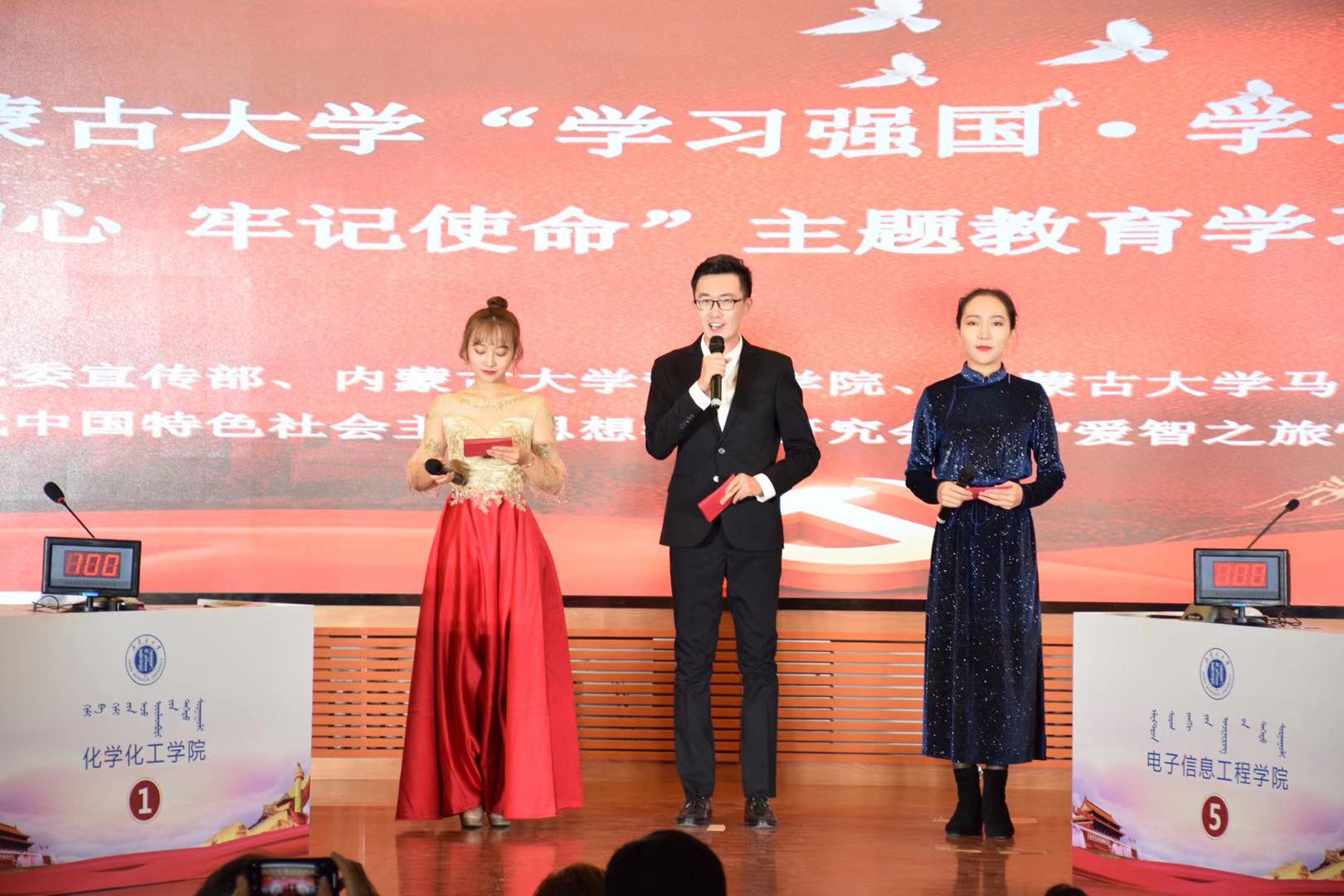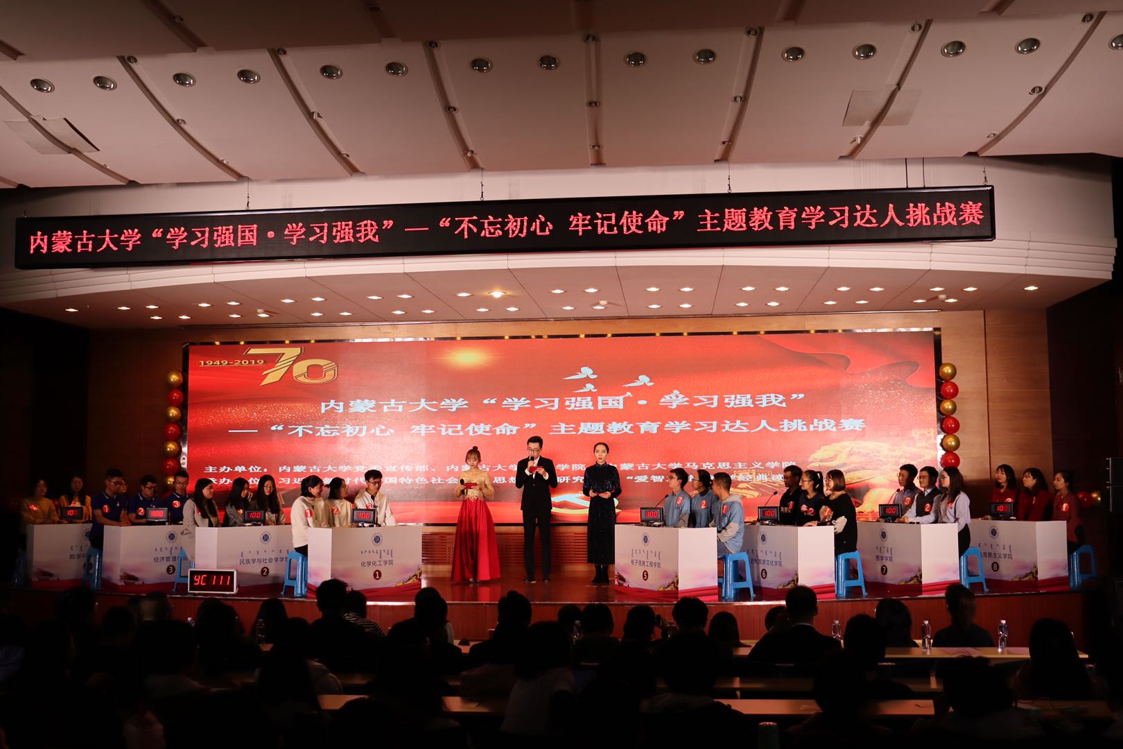为赞颂中华人民共和国成立70周年取得的辉煌成就,积极贯彻落实学习强国的精神,使全校师生在习近平新时代中国特色社会主义思想的指引下,切实增强政治意识,牢固树立起中国特色社会主义道路自信、理论自信、制度自信、文化自信,掀起广大师生深入学习马克思主义理论和知党史、学党章、明党规的热潮,我校“学习强国·学习强我”——不忘初心 牢记使命”主题教育学习达人挑战赛决赛于2019年11月17日在内蒙古大学北校区学术会议中心9号会议室隆重举行。