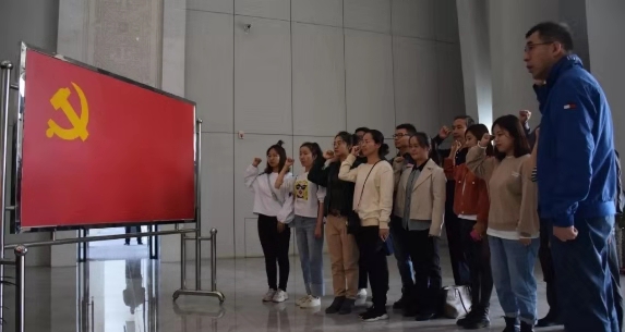 在参加纪念馆时,365英国上市公司党总支书记、院长景剑峰带领全体党员面向党旗,重温誓词,庄严宣誓:对党忠诚,为共产主义事业奋斗终身。