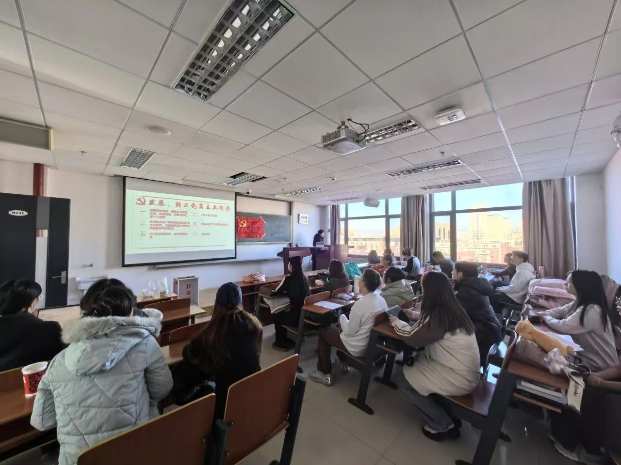 支部书记穆明慧宣布发展对象拟成为预备党员名单及预备党员转正名单,两位同志依次汇报了自己的个人表现,总结在思想、学习、生活等各方面的进步与不足,始终以党员标准严格要求自己,坚定跟党走的政治信念。