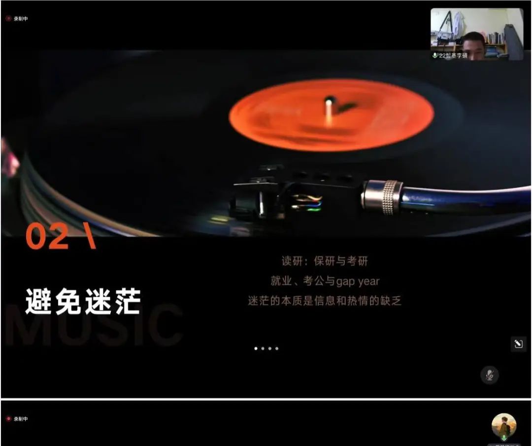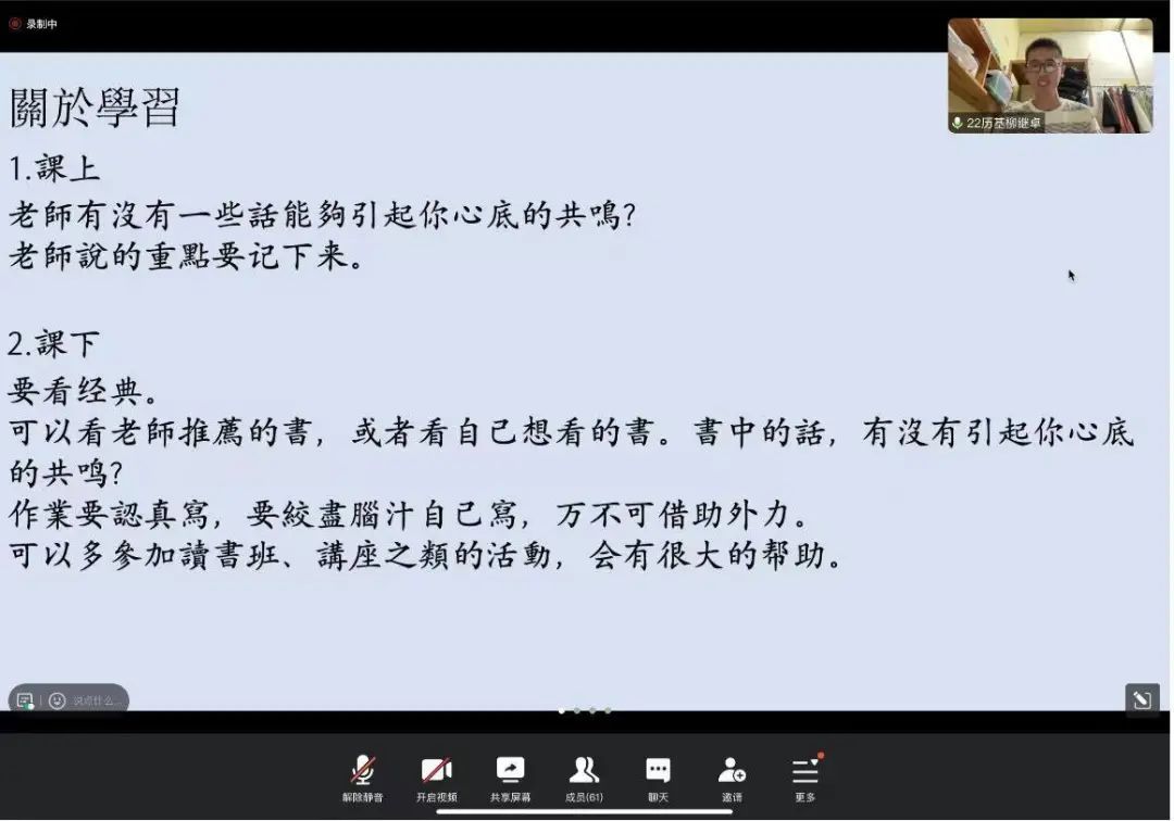 交流会正式开始后,首先,易彤璟以“金榜题名之后”为题,从“认识自己”“关于学习”“关于生活”“推荐资源”四个方面分享了自己大学两年多以来的学习经历与人生思考。随后,柳继卓讲述了对文史哲三大学科融会贯通的感悟与如何协调专业学习与学生工作、业余生活之间的关系。最后,李硕讲述了高中与大学的区别,在“避免迷茫”、“超出应试”等方面与同学们进行经验分享并给出“避雷”告诫。