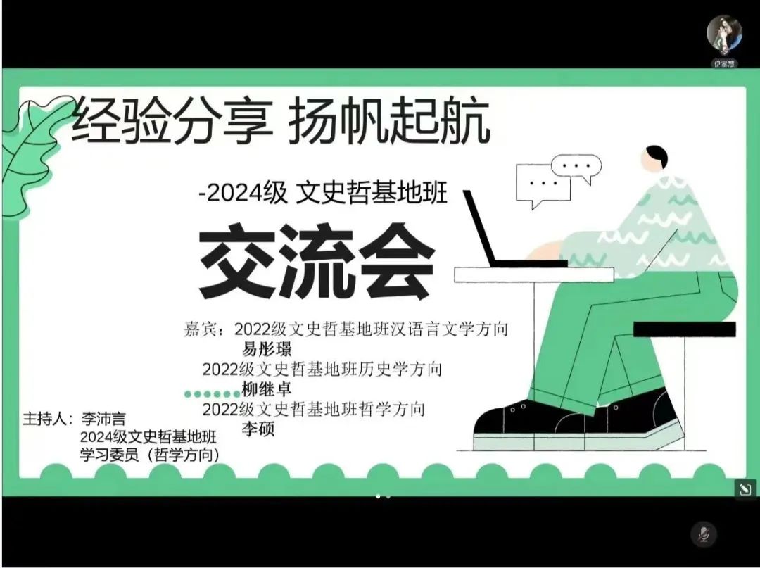 为了让新生更好地了解大学学习与生活,确立努力方向和奋斗目标,2024 级文史哲基地班于 2024 年 9 月 27 日 19:00 以线上会议的形式成功举办学习经验分享交流会。正在北京大学进行交流学习的 22 级文史哲基地班汉语言文学方向易彤璟、历史学方向柳继卓、哲学方向李硕与新生进行了充分交流。