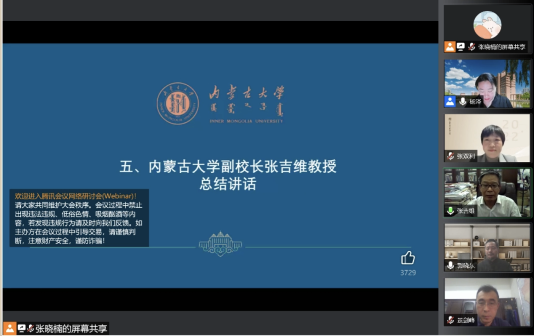 最后,张吉维副校长对本次活动做总结讲话,指出内蒙古大学与复旦大学有着深厚的历史友谊,近年来又成为对口合作建设高校。这次线上讲座复旦哲人用前沿的学术眼光、深邃的思想、敏锐的哲学意识,为内大师生带来了宝贵的思想盛宴。全国多所高校师生共同聆听,产生了良好了学术影响。同时也引导每一位听众深化哲学的思考,开拓学术视野,从方法论上思学明辨,潜心思考审视。这是复旦哲人做出的巨大贡献,感谢组织协调本次讲座的各位老师。
