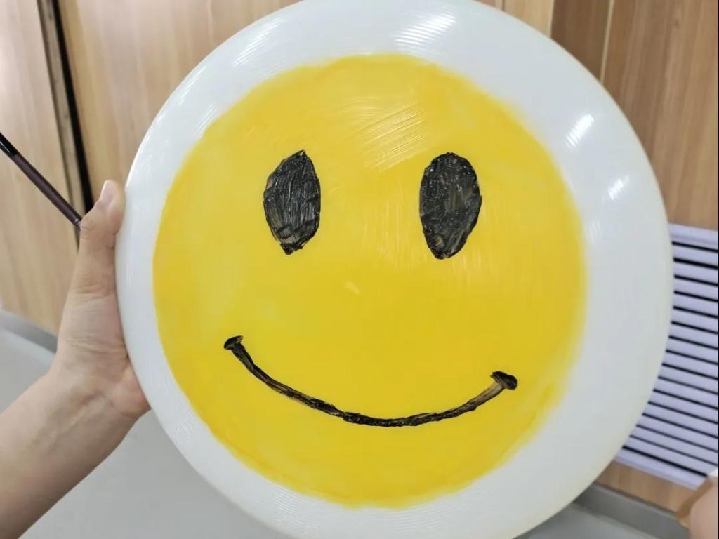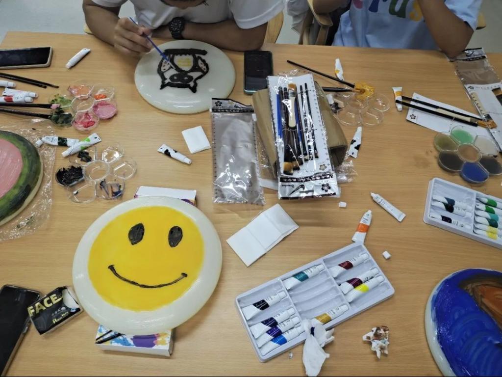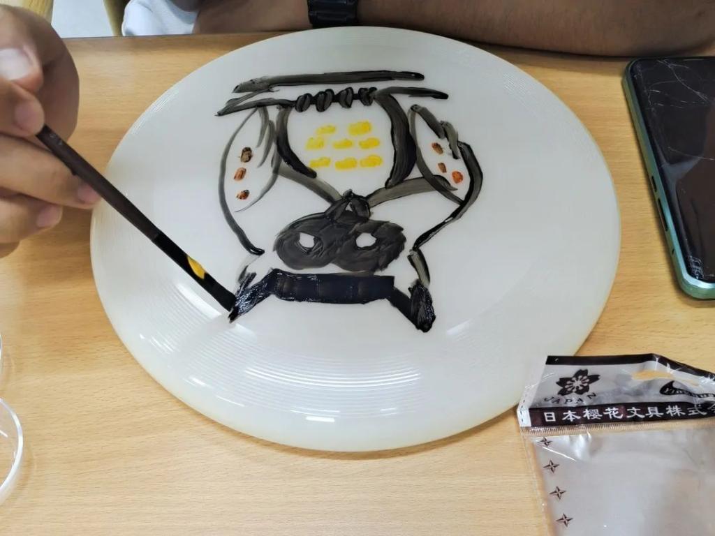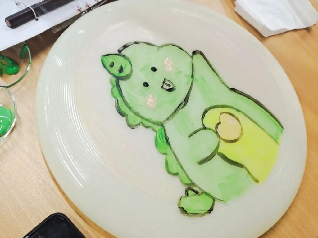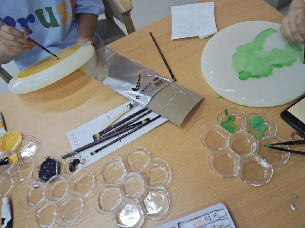 活动准备时,同学们用画笔在飞盘上描绘了多彩的图画,可爱生动的小恐龙和猫头鹰让整个游戏更加有趣。