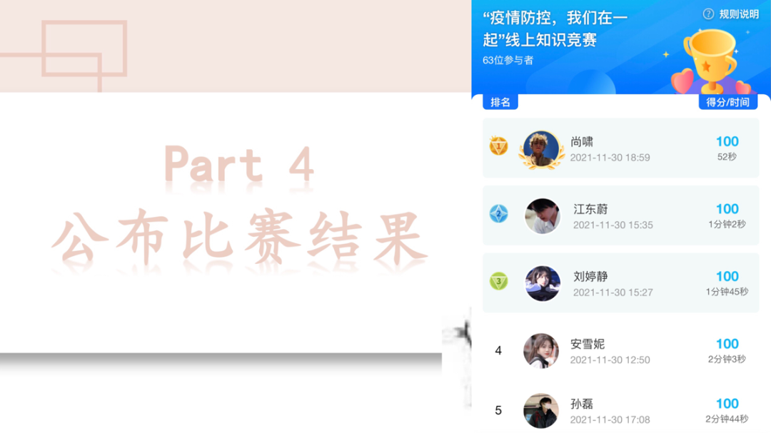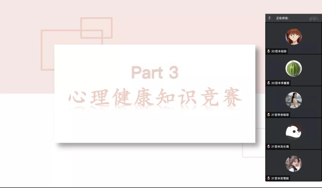 接着进入线上心理知识竞赛环节,通过趣味化方式进行知识宣传更易被接受。同学们基于自己的心理健康知识储备参与答题,获胜者将予以奖励。在生活中,面对汹汹疫情,同学们总会不自觉地心情紧张,焦虑不安,而这又中了新冠病毒的心理攻势的圈套。保护同学们的心理健康与心态平稳,这就是我们365英国上市公司举办线上心理健康知识竞赛的目的。在竞赛过程中,同学们不仅可以激励同学们积极了解心理健康知识,同时能够熟悉疫情形势下如何保护自身心理安全的措施。