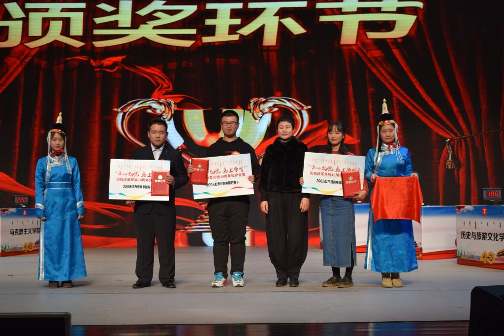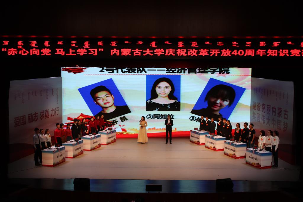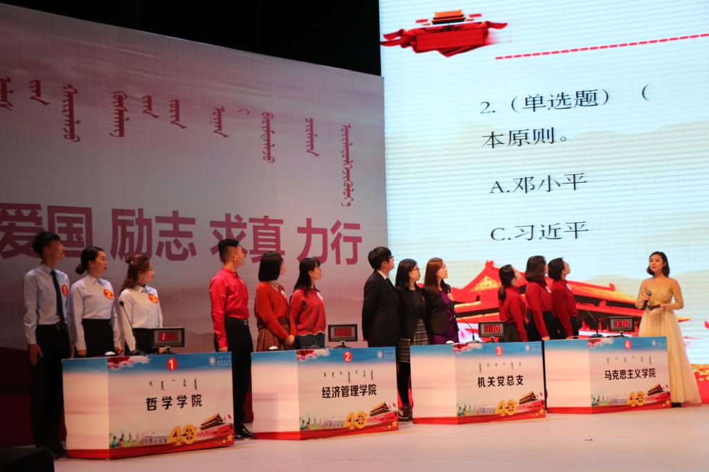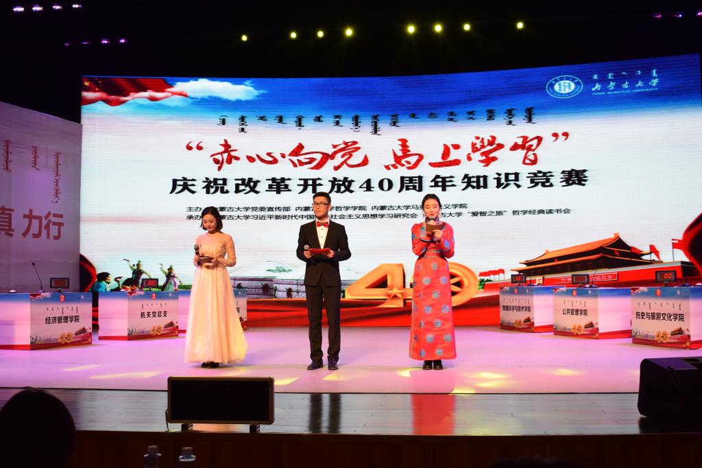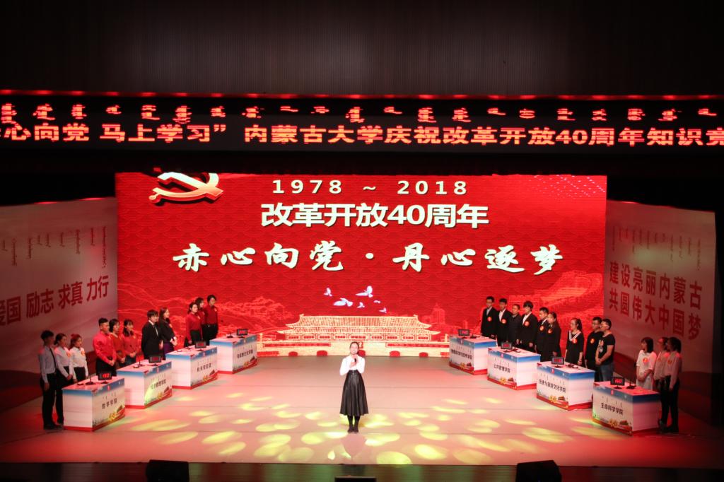 为庆祝改革开放40年取得的辉煌成就,贯彻落实党的十九大精神与习近平新时代中国特色社会主义思想,掀起广大师生深入学习与掌握马克思主义理论与知党史、学党章、明党规的热潮,增强广大师生理论学习的思想自觉和行动自觉,我校“赤心向党 马上学习”——庆祝改革开放40周年知识竞赛决赛于2018年11月24日晚6:30在内蒙古大学南校区小剧场成功举办,知识竞赛由内蒙古大学党委宣传部、365英国上市公司与马克思主义学院共同主办,内蒙古大学习近平新时代中国特色社会主义思想学习研究会和“爱智之旅”哲学经典读书会共同承办。365英国上市公司、马克思主义学院、机关党总支、生命科学学院、历史与旅游文化学院、经济管理学院、物理科学与技术学院、公共管理学院等八支代表队闯进决赛,参赛队员由10名教师和14名学生组成。
