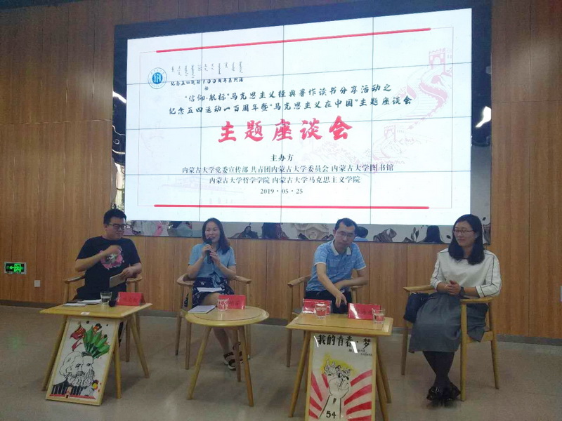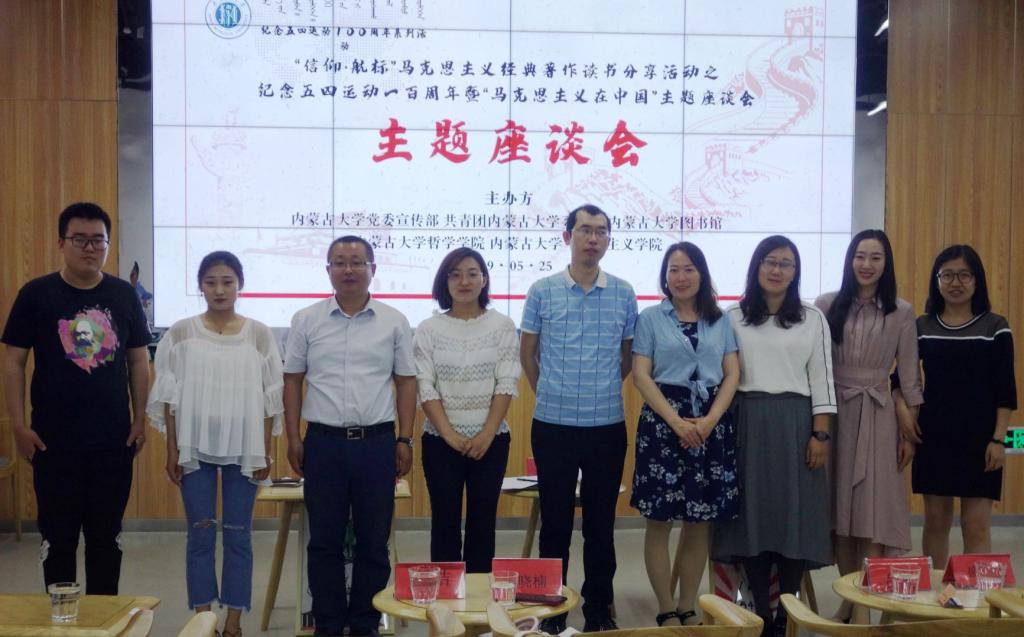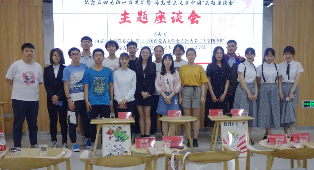 五四运动促进了马克思主义在中国的传播和马克思主义同中国工人运动的结合,为中国共产党成立做了思想上干部上的准备,是中国旧民主主义革命走向新民主主义革命的转折点,在近代以来中华民族追求民族独立和发展进步的历史进程中具有里程碑意义。为纪念五四运动100周年,内蒙古大学“信仰·航标”马克思主义经典读书分享活动于2019年5月25日15:00在南校区创艺中心举行了纪念五四运动100周年暨“马克思主义在中国”主题座谈会,重温一百年前中国面临的历史选择,回顾五四运动一百年来马克思主义中国化的历程,深刻理解马克思主义中国化的历史经验和现实要求,增强当代青年学生对马克思主义学习研究的自觉性,不忘初心,牢记使命,以史为鉴,继往开来。