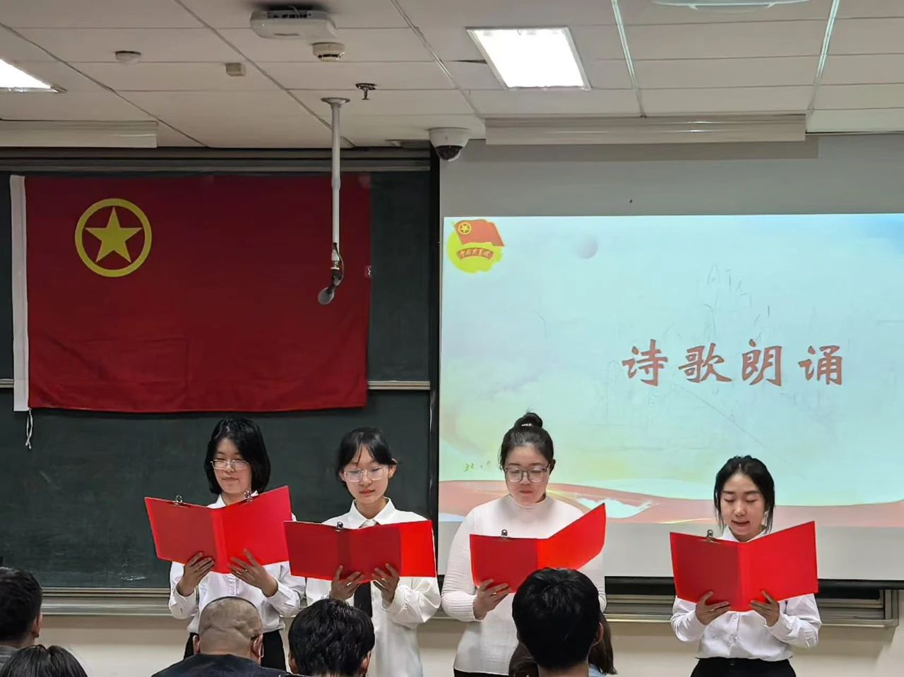支部全体成员共同观看了前期活动中拍摄的爱国主题视频。李治霖、郝悦蘅同学进行了《毛泽东文集》和《创业史》红色书目分享。张璐帆、田静媛、王晓芙和郭菁苒同学朗诵了经典红色文本《青春》(节选)。展现了支部团员青年爱党爱国的深厚情感与坚定信念,进一步激发了大家的爱国主义热情。