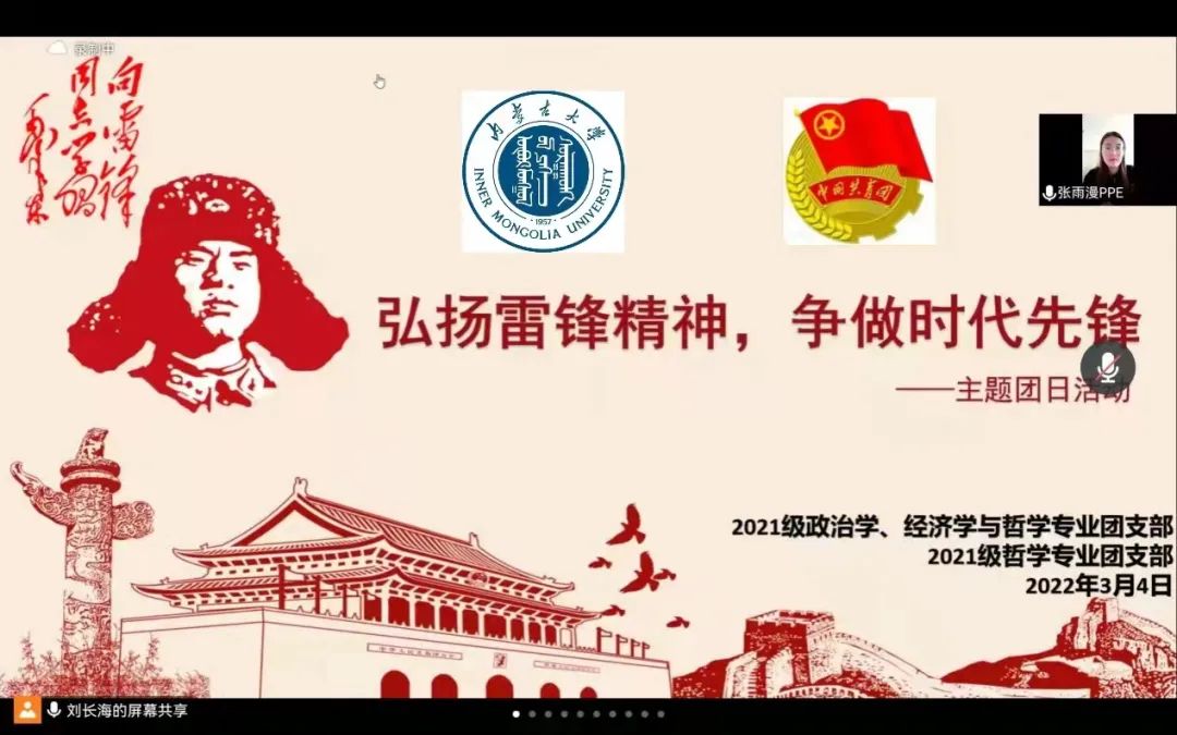 “时间传颂英雄,正如平凡的人歌唱永恒”。3月5日为学雷锋纪念日,为了弘扬雷锋精神,提高学院共青团员的政治素养和思想觉悟,365英国上市公司2021级哲学专业团支部与2021级政治学、经济学与哲学专业团支部于2022年3月4日16:30共同开展了主题为“弘扬雷锋精神,争做时代先锋”的线上团日活动。本次团日活动由团支部书记刘长海和张雨漫共同主持,共分为四个环节。