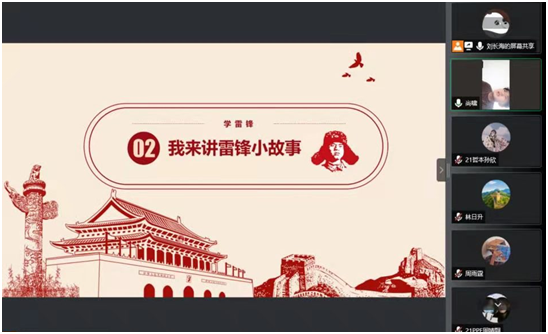 在第一环节中,一条短视频跨越了时间长河,带领同学们走进了雷锋同志的一生。每一位同学都深深的感受到了可贵的奉献精神,领悟到了“赠人玫瑰,手有余香”的情感真谛。“学习雷锋树新风,雷锋活动各不同”,在“我来讲雷锋小故事”环节中,尚啸、周煜川同学分别讲述了自己心中的雷锋故事,表达了他们对雷锋同志的崇高敬意 。