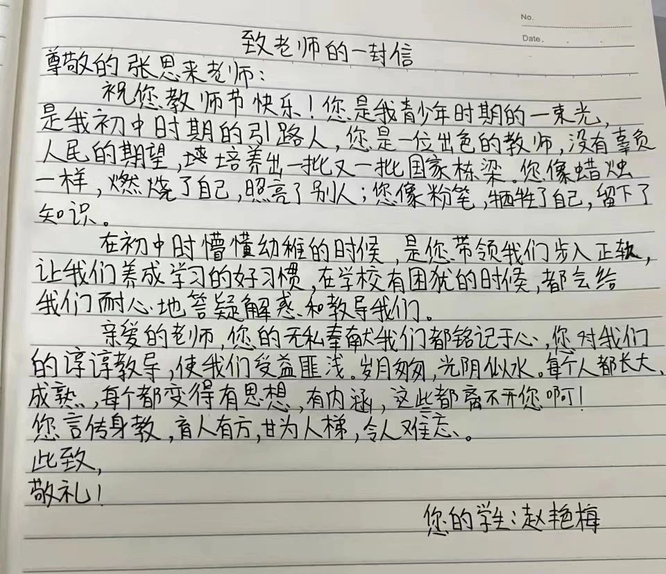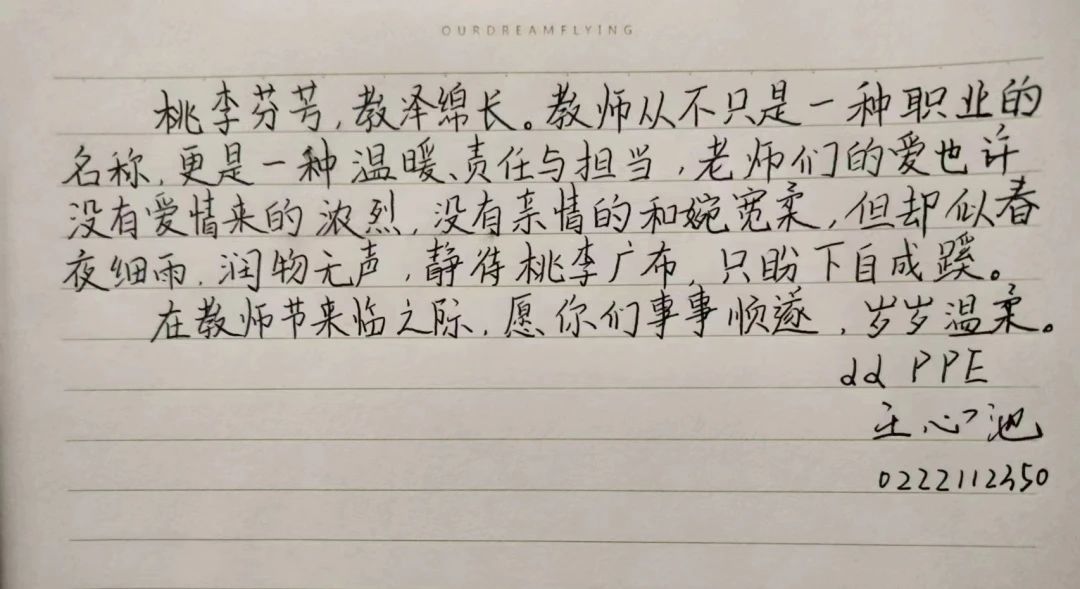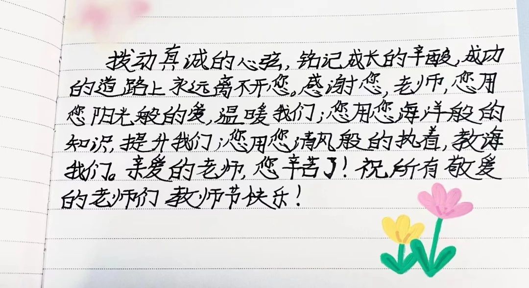 你们如罗盘指引方向,教我们描绘人生的第一笔蓝图,你们以春风化雨的温柔,对我们关怀备至;以博古通今的学识,带领我们徜徉知识之海。老师们高尚的人格感染着我们,谆谆教导与切切关怀犹如清风温和抚过,抚平我们的幼稚与顽劣,让我们沐浴在阳光下,从新生的幼苗成长为参天的大树。“善之本在教,教之本在师。”教师的存在,让善良的种子代代播撒,永不断绝。感恩所有老师,因为有你们,我们更加灿烂。