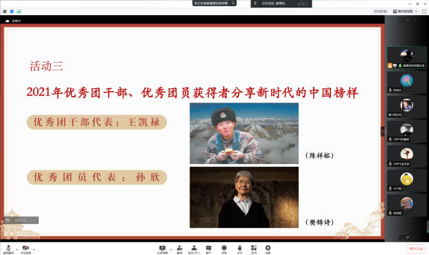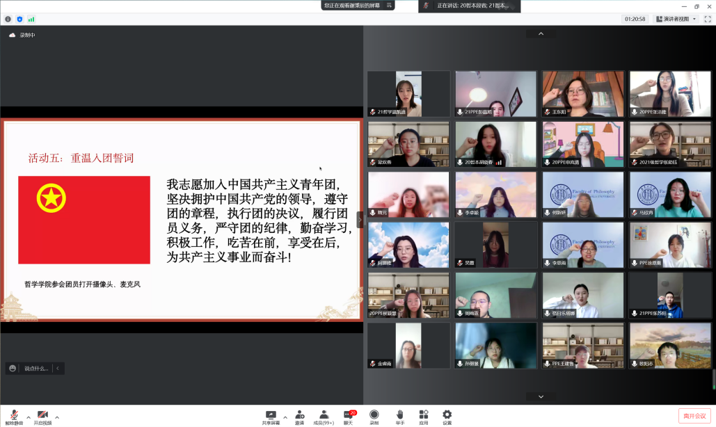 活动最后,所有参会成员打开摄像头和麦克风,举起右拳,跟随团支书重温入团誓词,本次活动在大家庄严整齐的宣誓声中落下帷幕。