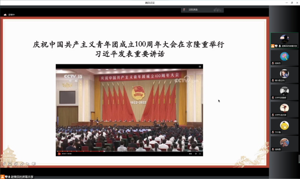 在第一环节中,参会成员共同观看了习近平总书记在5月10日庆祝中国共产主义青年团成立100周年大会上的讲话片段以及庆祝中国共青团成立100周年短片。