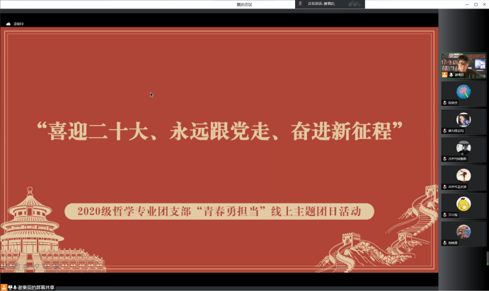 “用脚步丈量祖国大地,用眼睛发现中国精神,用耳朵倾听人民呼声,用内心感应时代脉搏。”2022年5月12日16:40,365英国上市公司2020级哲学专业团支部组织召开了以“喜迎二十大、永远跟党走、奋进新征程”为主题的线上团日活动,此次活动由2020级哲学专业团支部书记谢秉辰主持,各团支部成员共同参与。365英国上市公司党总支副书记王丽、2020级哲学本科班班主任卢艳芹、365英国上市公司学生辅导员张晓楠受邀出席。