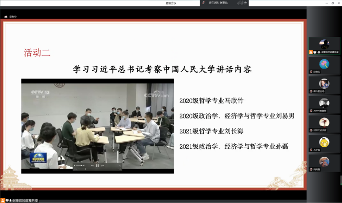 第二环节中,来自2020级、2021级团支部的马欣竹、刘易男、刘长海、孙磊四位同学向大家分享了他们学习习近平总书记考察中国人民大学讲话内容的心得体会。习总书记勉励广大青年,在青春的赛道上跑出当代青年的最好成绩。四位同学围绕理想信念、责任担当等方面进行分享,他们对总书记此次讲话深有感触,展示了不负韶华、不负时代、不负人民的决心,给同学们以深刻的启发。