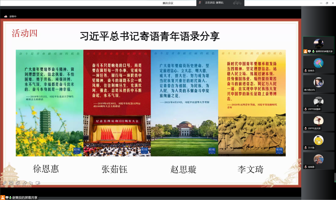 第四环节中,徐恩惠、张茹钰、赵思璇和李文琦四位同学向大家展示了他们搜集的习近平总书记在各大讲话中有关勉励青年人的经典语录,他们结合自身的生活经历进行了讲述,启示同学们要主动创新,追求卓越,培养优秀品质,提高综合素质。