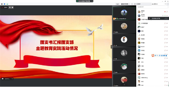 会议第一项,全体团员唱团歌。会议第二项,团干部汇报了本支部今年开展的主题教育实践活动情况,并结合全年团支部工作和个人实际交流认识与体会。团小组组长汇报了各小组前期开展小组学习的情况,并作为小组代表分享了对今年主题教育实践活动的收获与认识。会议第三项,围绕“有信仰、讲政治、重品行、争先锋、守纪律”五个方面,开展了团员先进性民主测评投票,并民主评议优秀等级团员。会议第四项,团支书带领全体团员重温了入团誓词。