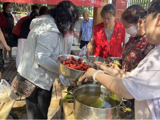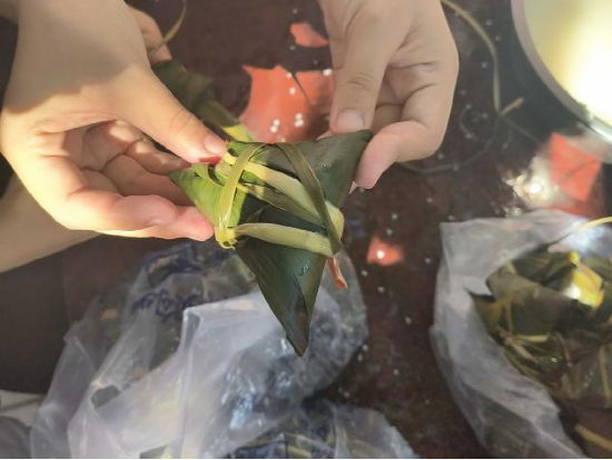 “棕子香,香厨房;艾叶香,香满堂;桃枝插在大门上,出门一望麦儿黄;这儿端阳,那儿端阳,处处都端阳。”活动现场,志愿者们和社区老人、工作人员们分工合作,为大家传授前期糯米、粽叶等相关材料的准备方法和制作技巧,展示包粽子的基本手法以及将粽叶做成漏斗状、填糯米、压紧实、封口、扎捆等各环节细节,“巧手”们积极示范,“新手”们努力尝试,一个又一个有模有样的粽子在大家手中有了雏形。看着大盆小盆的粽子,大家脸上都露出了开心、满足的笑容。粽子虽小,情谊却大。这些粽子里不仅饱含着支部团员青年们的爱心,还有利于带动同学们尊老、敬老、爱老,传承和发扬中华民族的传统美德。