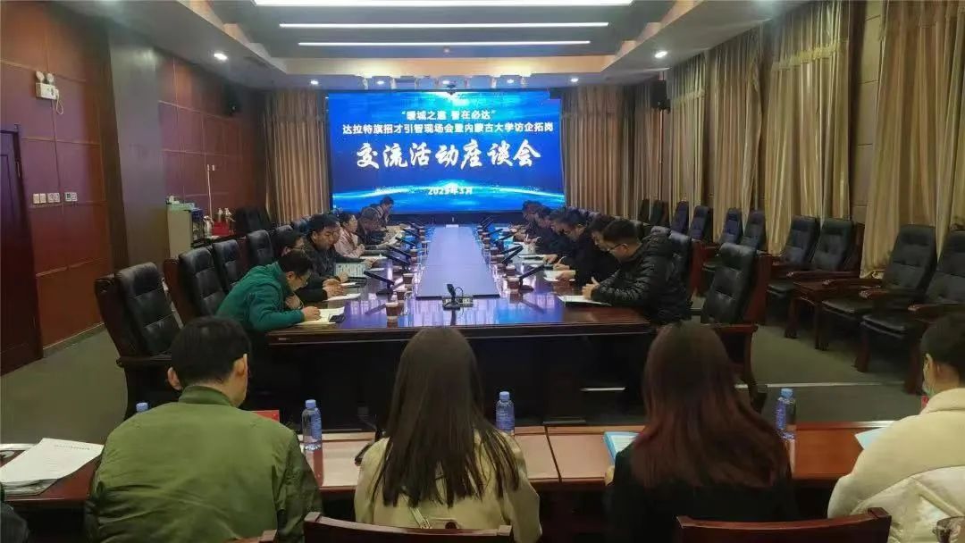 本次活动第二项是当日11:30于达拉特旗政府801会议室召开达拉特旗招才引智现场会暨内蒙古大学访企拓岗交流活动座谈会,由达拉特旗政府三级调研员张钊主持,参会成员包括内蒙古大学代表团一行、达拉特旗旗委组织部、旗人社局、旗工信和科技局、达拉特经济开发区相关负责同志、达拉特旗各企业代表。